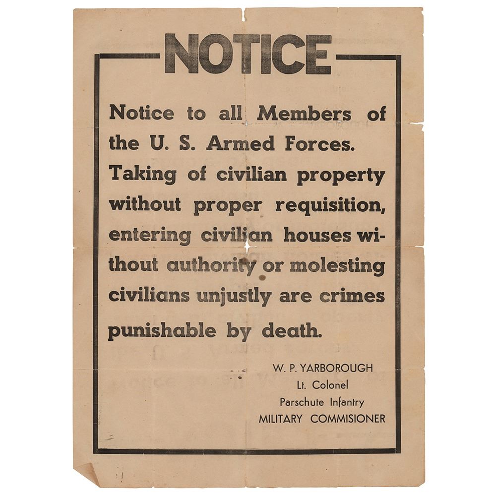 Scarce World War II-dated broadside issued by Military Commissioner Lt. Colonel William P. Yarborough of the Parachute Infantry, one page, 12.5 x 17, posted as a notice to deter U.S soldiers from committing war crimes. In full: “NOTICE: Notice to all Members of the U.S. Armed Forces. Taking a civilian property without proper requisition, entering civilian houses without authority or molesting civilians unjustly are crimes punishable by death.†In very good to fine condition, with splitting, and small areas of paper loss, along the intersecting folds.