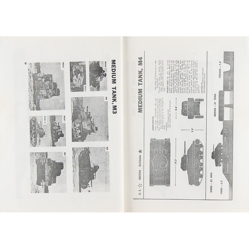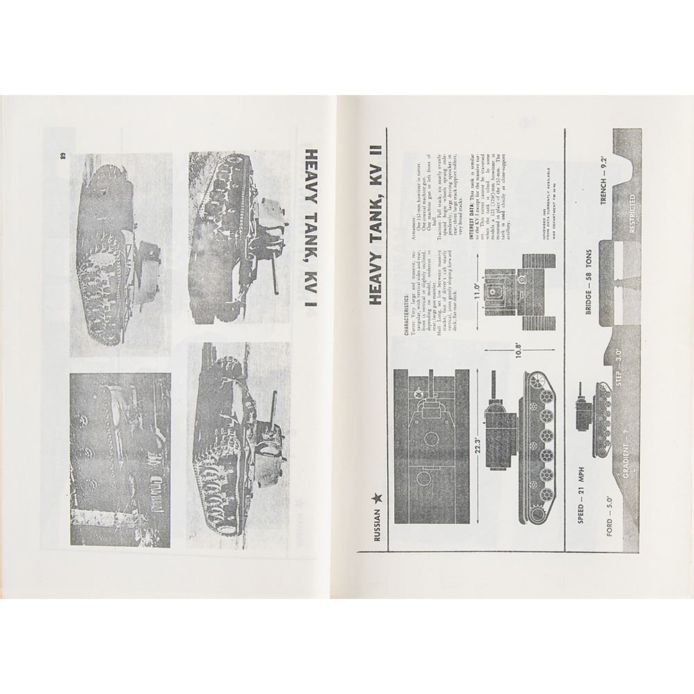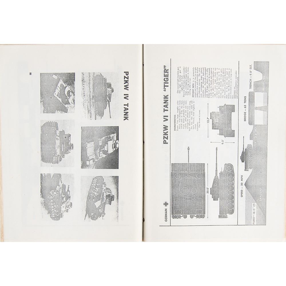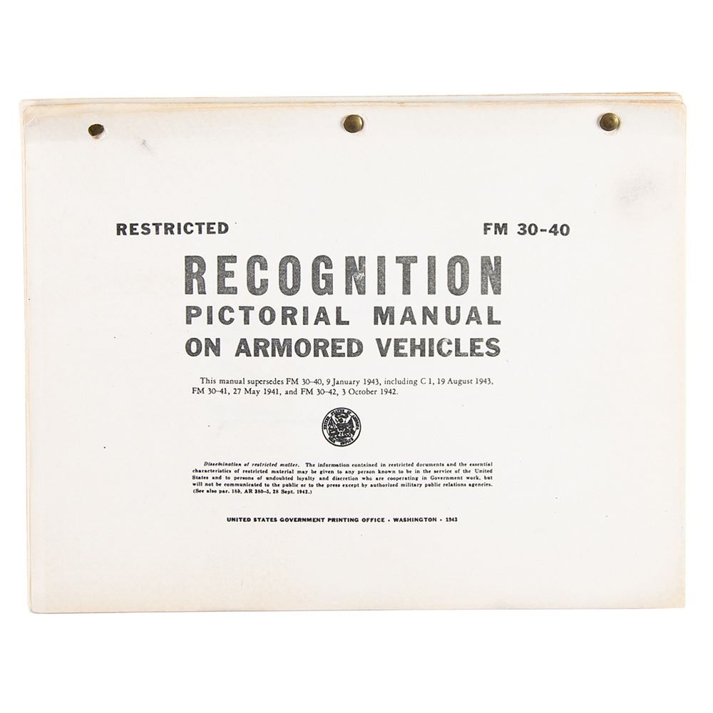 Original World War II-era brad-bound photostat manual entitled "Recognition Pictorial Manual on Armored Vehicles," published by the United States Government Printing Office in 1943, 110 pages, 11 x 8.5, depicting and describing the armored military vehicles of the United States, Great Britain, Russia, Germany, Italy, and Japan. In very good to fine condition, with front cover missing.