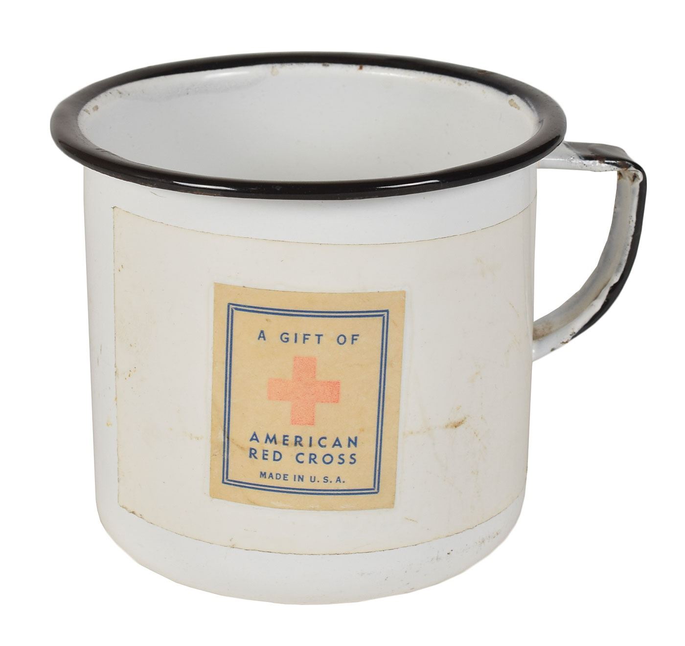 Black-and-white enamel mug attributed to the famous 'Great Escape' Stalag Luft III prison camp, measuring 3.25? tall and 3.75? in diameter, bearing a paper label on the front, "A Gift of American Red Cross, Made in U.S.A.," secured more recently with a large strip of cello tape. In fine condition, with general wear from use. Provenance: Bonhams, The War Museum. Stalag Luft III was a German POW camp in Silesia (now western Poland), which was operated by the Luftwaffe and held captured British and American airmen. It is best known for being the site of the massive breakout of 76 men, depicted in the classic film The Great Escape starring Steve McQueen.