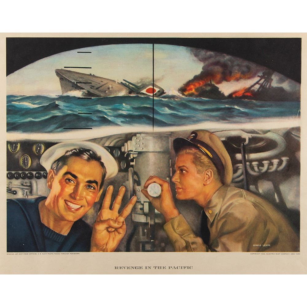 World War II-dated color 23.5 x 17.5 print published by the Electric Boat Company of New York in 1943, entitled ‘Revenge in the Pacific,’ featuring artwork by Gerald Leake of the Japanese destroyer Yamakaza sinking after being hit with a torpedo by the American submarine the USS Nautilus, with a U.S. officer and sailor pictured below, the latter holding up three fingers for the number of Japanese vessels the submarine successfully hit and sunk and the former looking through a periscope. Framed and in fine condition, with some light creasing.