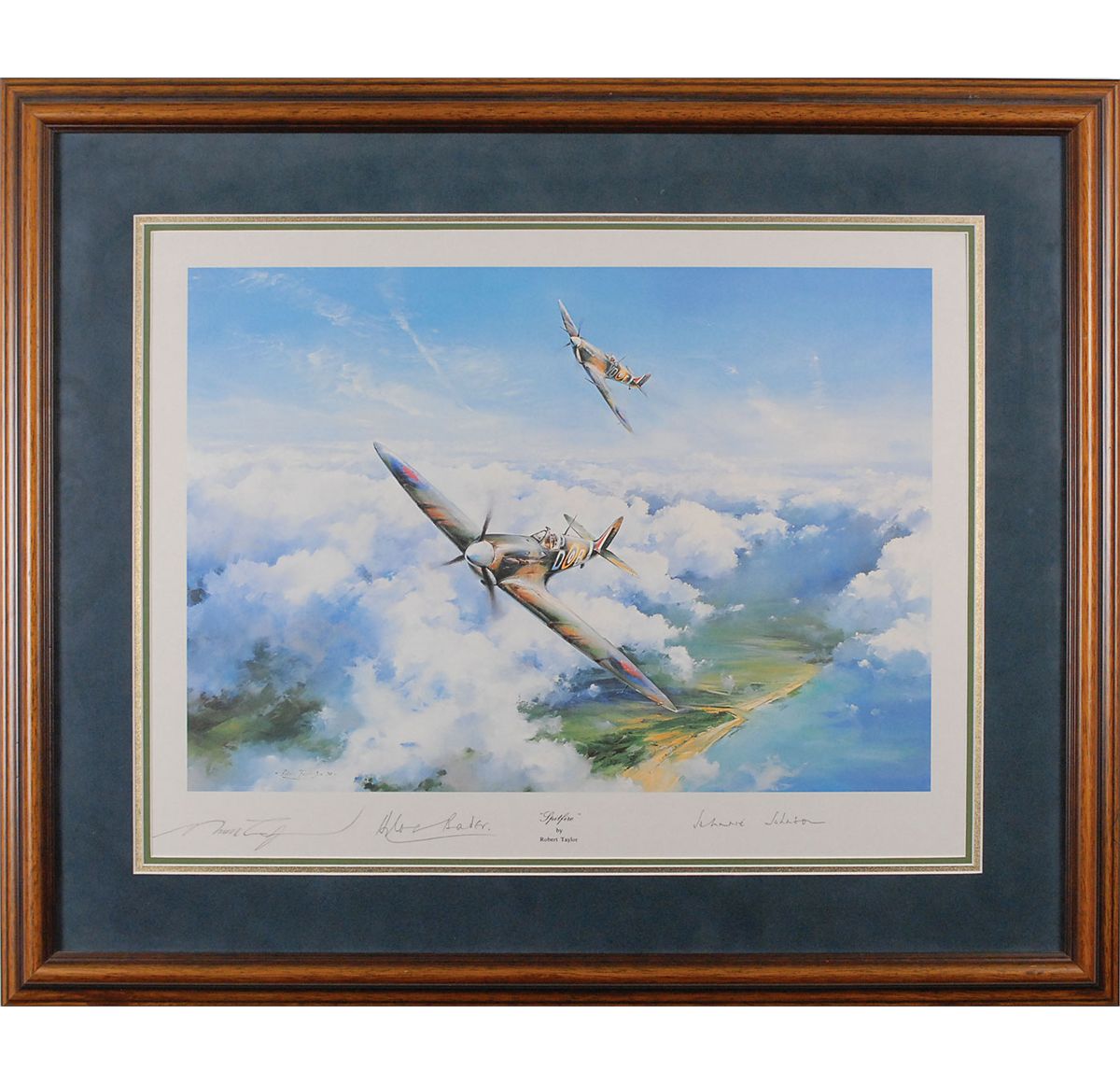 Color 20 x 15.75 print entitled ‘Spitfire,’ signed in pencil by Douglas Bader and Johnnie Johnson. Also signed in pencil by the artist, Robert Taylor. Triple-suede-matted and framed to an overall size of 28 x 23.5. In very fine condition. Oversized.