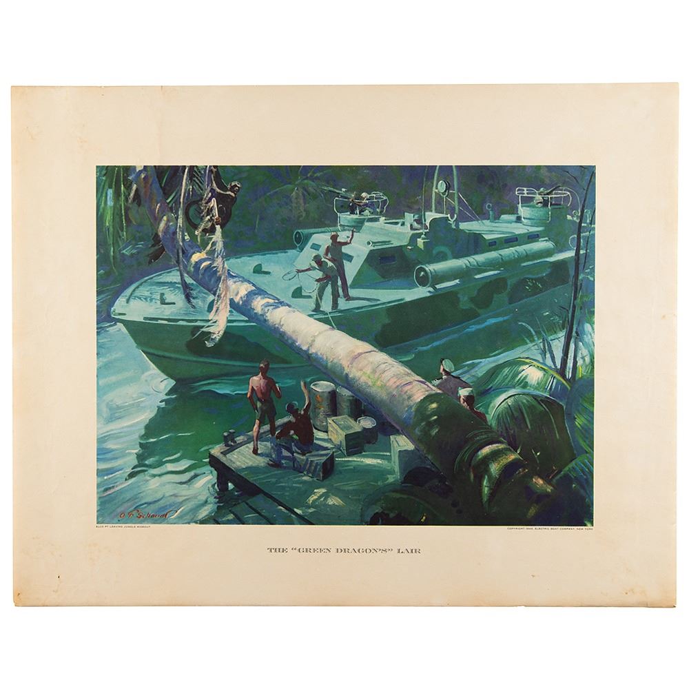 World War II-dated color 24 x 18.75 print published by the Electric Boat Company of New York in 1944, entitled ‘The ‘Green Dragon’s’ Lair,’ featuring impressive artwork by O. F. Schmidt of an Elco PT Motor Torpedo boat departing its jungle base, with men working and a monkey hanging overhead. In very good to fine condition, with small holes, creasing, and staining in the borders, and some paper loss to edges, which could be matted out if so desired.