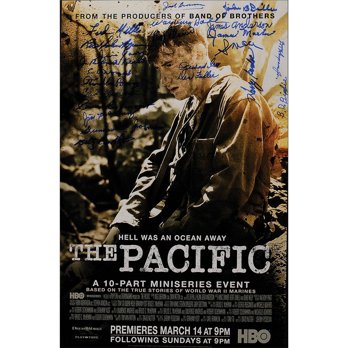 Color satin-finish 11 x 17 reproduction photo of a poster for the HBO series, The Pacific, signed in blue felt tip by 24 of the veterans who inspired the series. Rolled and in fine condition. Accompanied by photos taken at the time of signing.