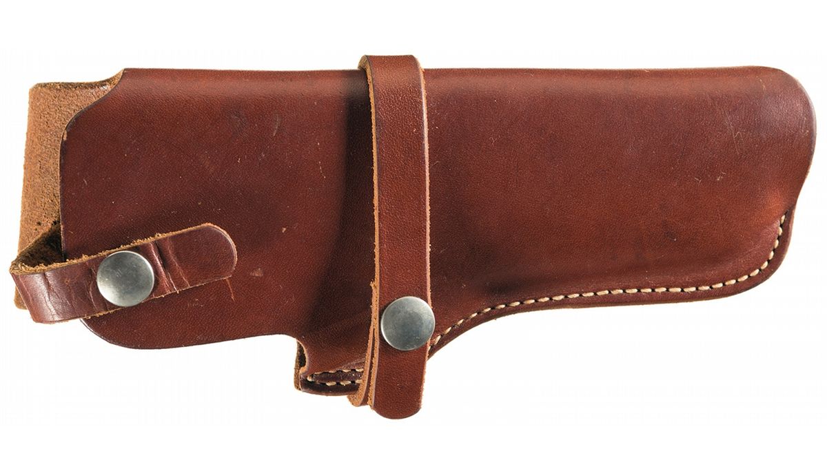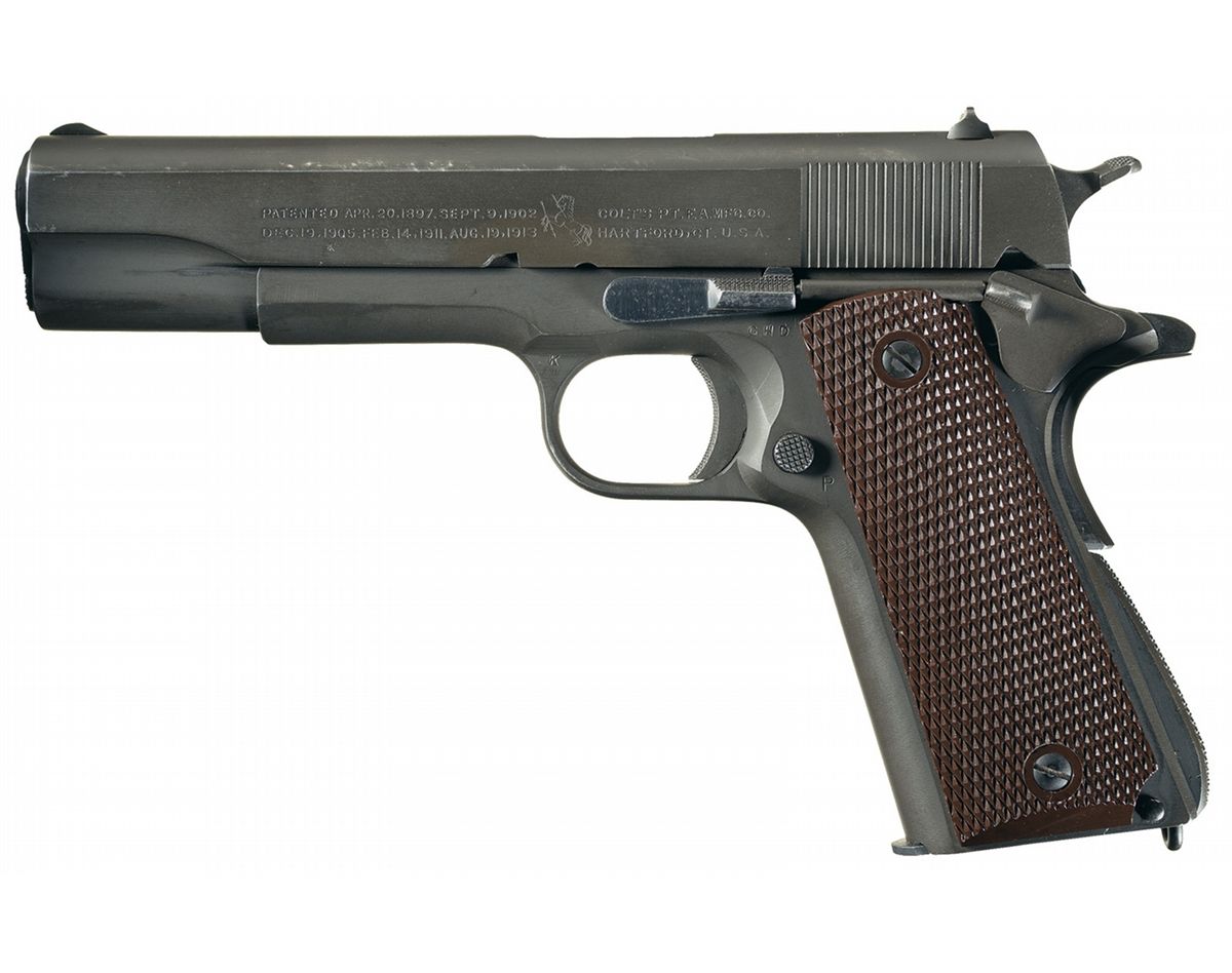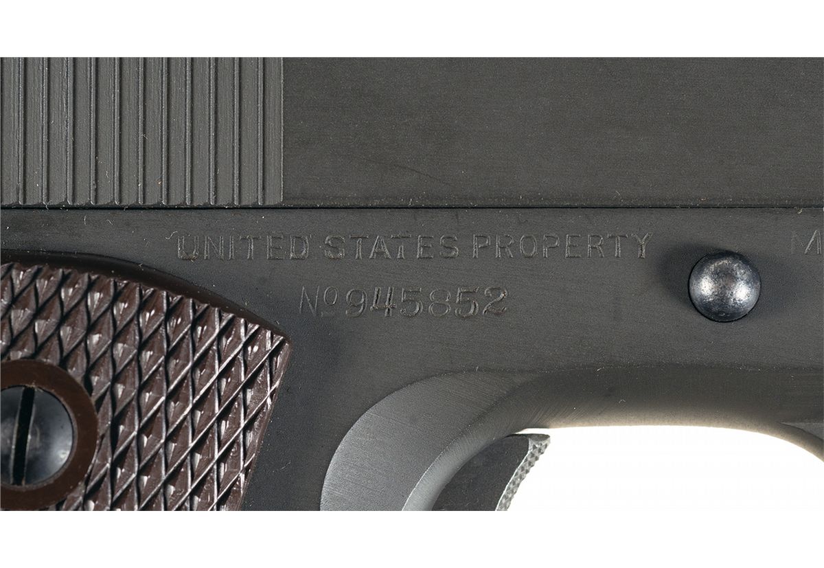 Manufactured in 1943. Serrated blade front and flat-top notch rear sights, with the two-line, two-block address on the left side of the slide divided by the Rampant Colt, "P" on top ahead of the rear sight, and the matching serial number beneath the firing pin block. The frame is "G.H.D." inspected, with "73" and "K/VP" on the trigger guard, a short milled trigger, checkered wide hammer, slide stop, thumb safety and arched mainspring housing, checkered ribbed Coltwood grips, commercial-production magazine and a "COLT 45 AUTO/P" marked barrel. With a brown leather Bucheimer holster.