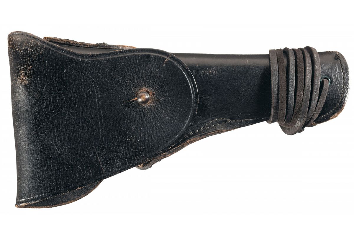 Condition: Excellent with replaced parts (see above), with 95% plus of the original parkerized finish, showing mild handling marks, a gray patina along the high edges and a few minor scratches on the frontstrap and triggerguard. Grips are excellent, with a few minor dents. Holster is fair, with the tip stitching removed, minor scuffing and verdigris. Mechanically excellent.