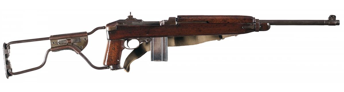 Inland barrel dated "10-42", Type I band, flat bolt, button safety and milled trigger guard. High wood pistol grip stock, 2-rivet handguard, leather cheekpiece, checkered steel buttplate and a green canvas sling.