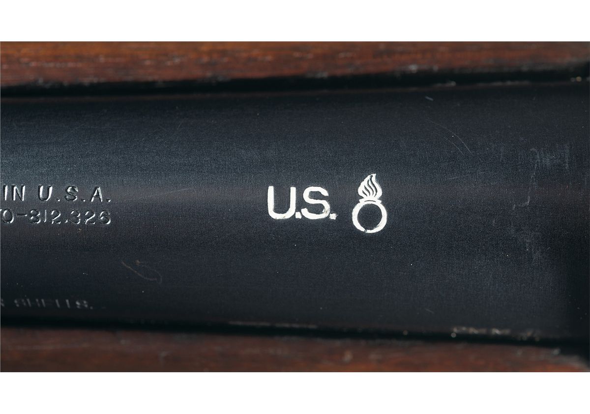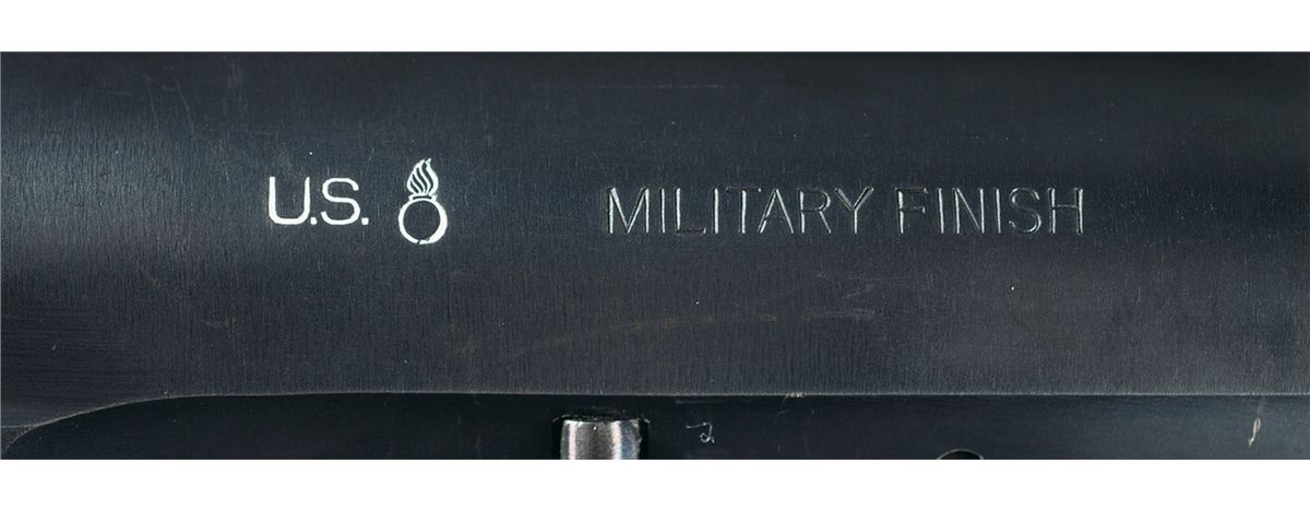 Single nickel bead sight, with a 2 3/4 inch chamber, "IMP.CYL." marked choke, "CMM(anchor)" date code (April 1943) on the left side of the barrel and "U.S. (bomb)" on top. The receiver is marked "U.S. (bomb) MILITARY FINISH". Smooth stock, with the crossed cannons and "FJA" cartouches on the buttstock, serrated plastic buttplate and a 14 inch length of pull.
