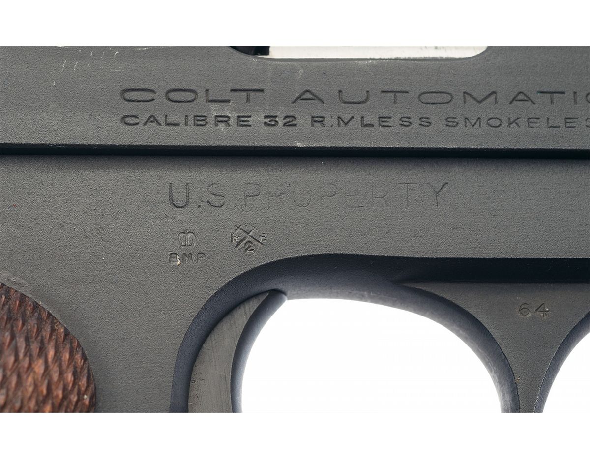 This is an outstanding like new condition late production, Colt U.S. contract M1903 Pocket pistol that was shipped to England at the beginning of WWII. The British markings indicate that the pistol was one of the "U.S. Property" marked M1903 pistols supplied to Great Britain under the Lend Lease Action 1939/40. Many of these pistol were intended/issued to the Special Operations Executive (SOE) Branch for clandestine operations in Nazi-occupied Europe. This exceptional pistol has both the "U.S. Property" and British Crown proofs. Over "BNP" proofs on the right side of the slide, and then directly below the U.S. Property markings on the frame it has the Crown over "BNP" and crossed pennants proofs. The chamber area of the barrel also has the full British firing and tonnage proofs. The barrel is bright over the chamber area with the remainder of the barrel and the one magazine all blued. The right side of the slide has the standard markings "COLT AUTOMATIC/CALIBRE 32 RIMLESS SMOKELESS" in two lines below the ejection port. The left side of the slide has the Rampant Colt trademark located behind the slide serrations and the two-line Hartford address and 1897/1903 patent dates in front of the serrations. The right side of the frame is marked "U.S. PROPERTY" above the trigger guard. The left rear side of the frame is stamped with a small Ordnance escutcheon and the serial number is located above the trigger. The left trigger guard bow is stamped with the Colt "VP" Verified Proof inside a triangle and the right bow is stamped with the assembler's number "44". The pistol has the standard smooth ramp front and flat top rear sight. The pistol has the dull green Colt, Parco-Lubrite finish and is fitted with checkered walnut grips inlaid with silver Colt medallions and is complete with one all blued magazine marked in two-lines on the base "CAL.32/COLT".