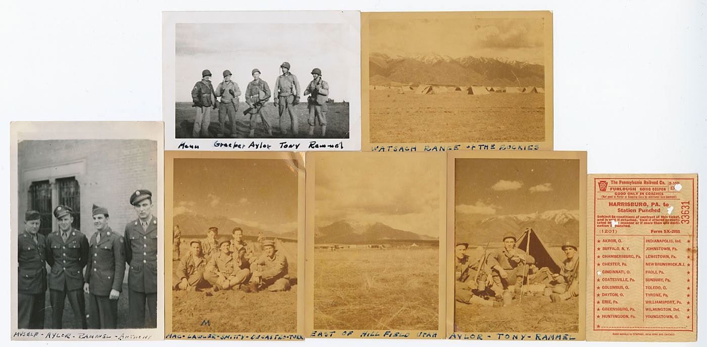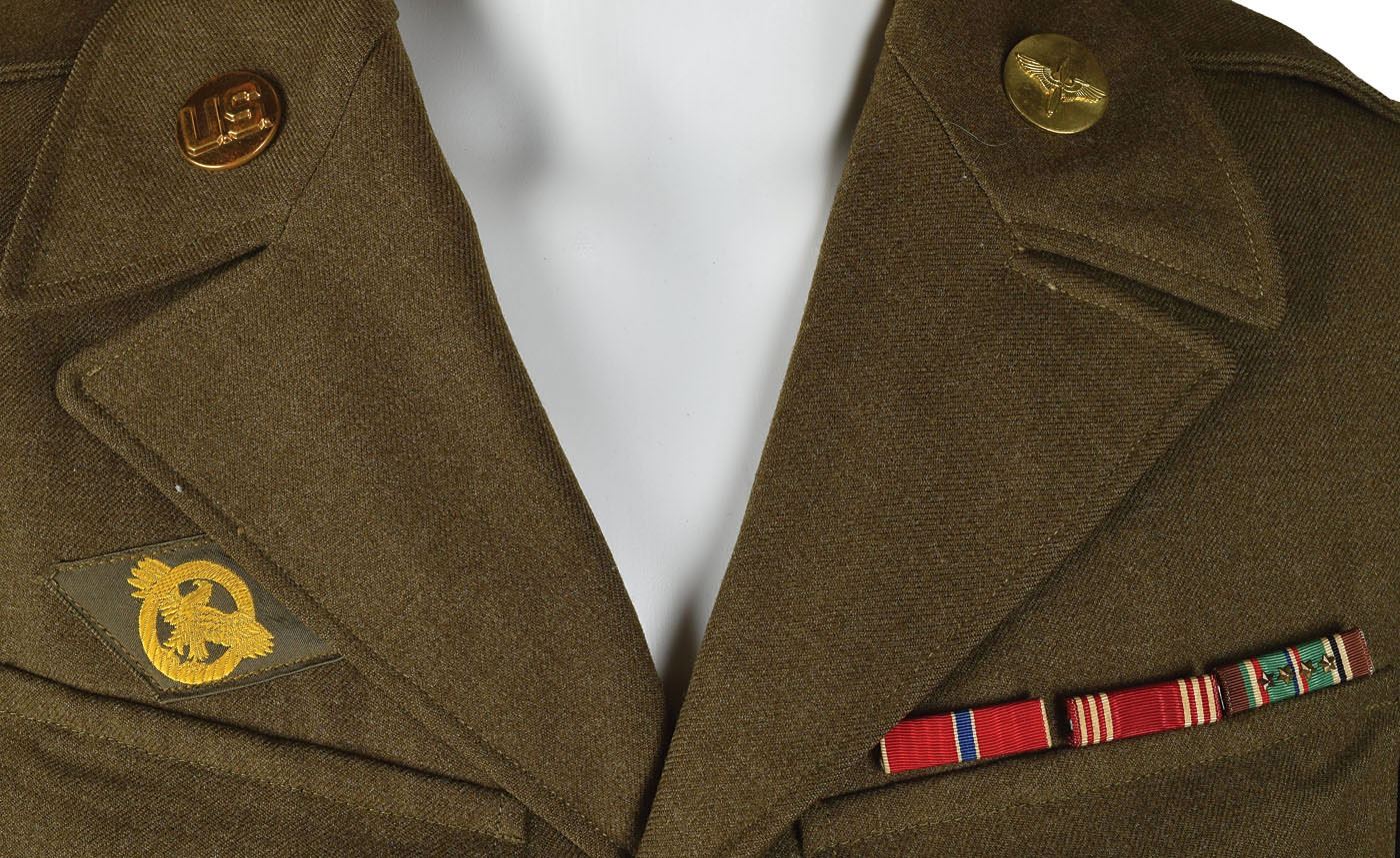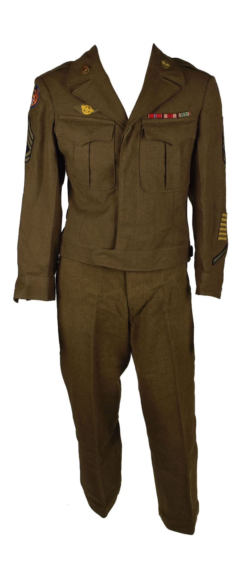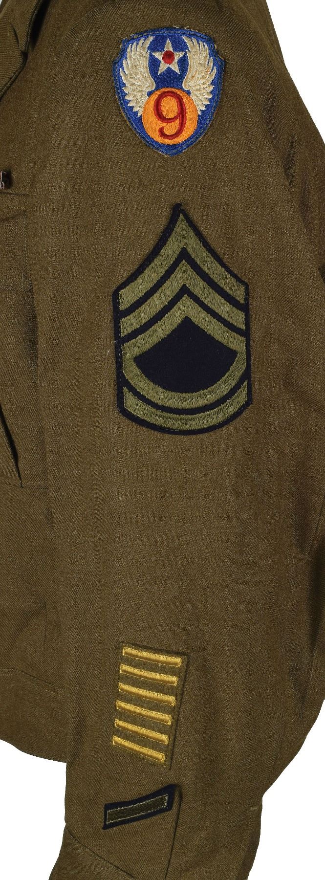 Desirable sergeant first class airman's uniform from World War II, comprising a jacket and pants. The jacket is size 38R, and it is adorned with ribbon bars on the left breast, one featuring four service stars. The right breast has a 'Ruptured Duck' honorable discharge patch. The sleeves feature chevron rank patches as well as embroidered shoulder patches for the 8th Air Force and 9th Air Force. The wool pants are size "W30/L31." Includes six original candid photographs taken by the airman, as well as a Pennsylvania Railroad furlough coupon. In fine condition.