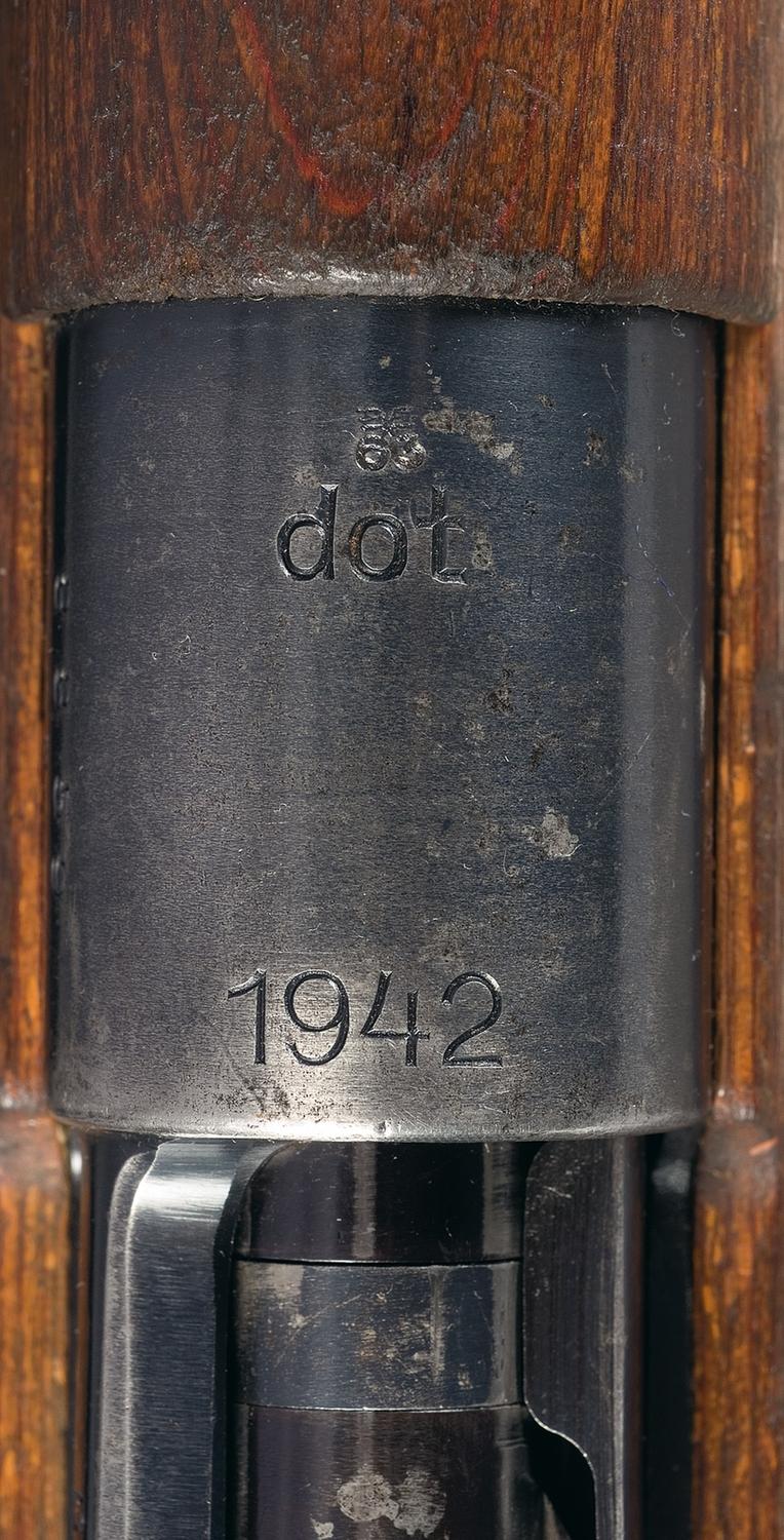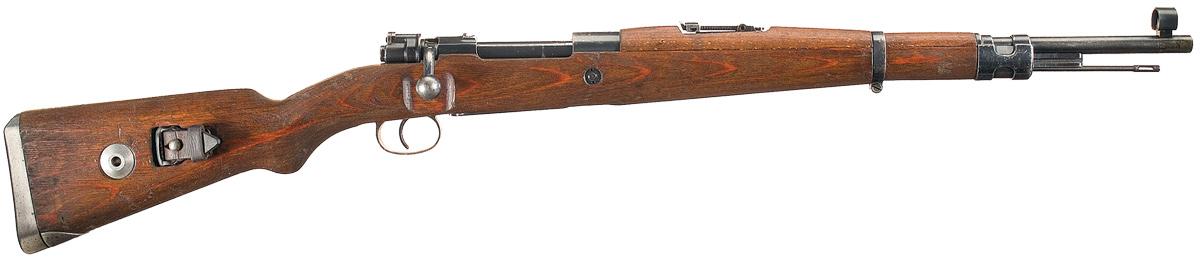 Hooded blade and tangent sights, with an "eagle/63" proof over the makers mark. Milled components, with "GERMANY" on the trigger guard and matching number on the bolt handle. Smooth stock with matching number and distinctive cupped and extended buttplate. With a black leather sling.