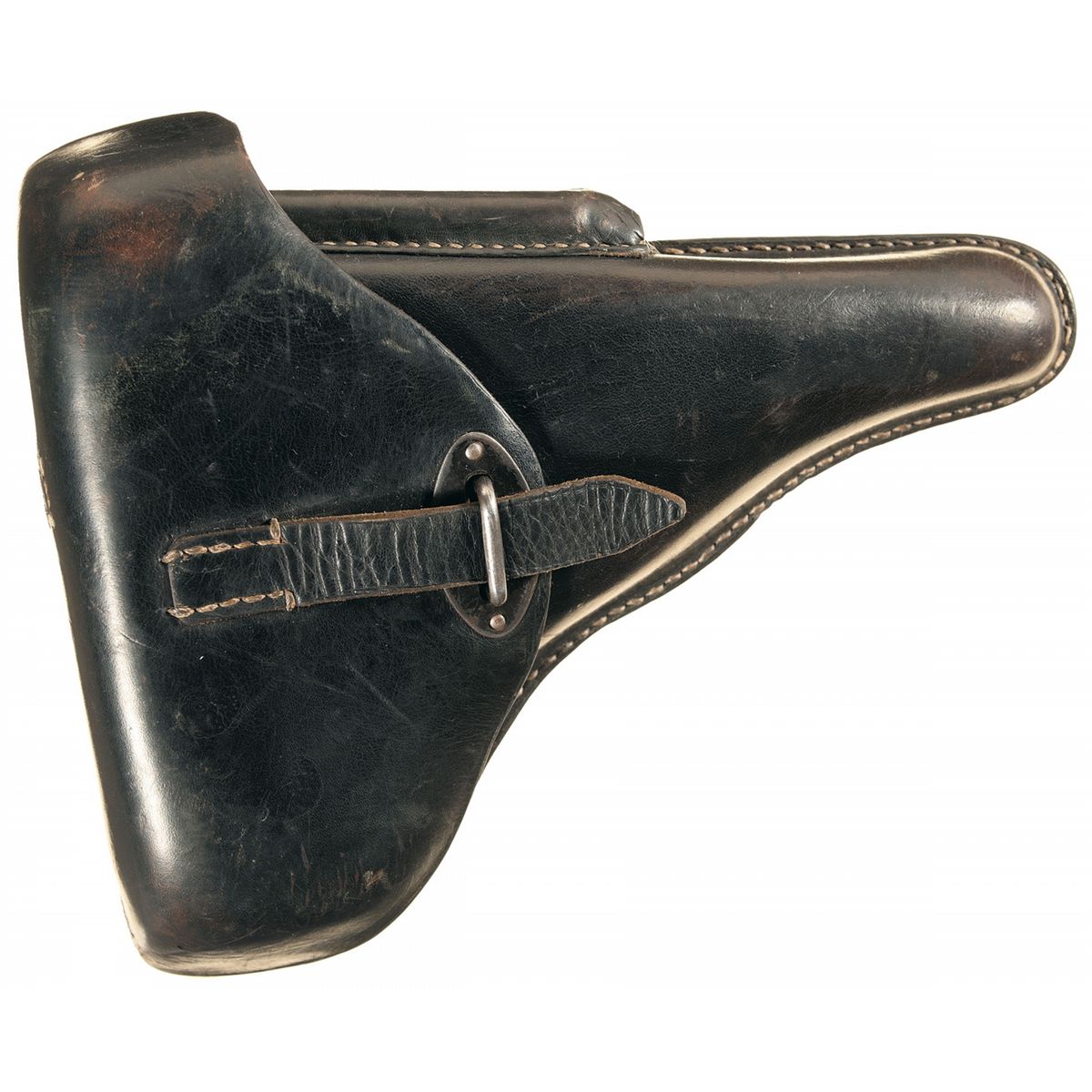 Most of the small parts carry "Eagle/359" proofs with the right side of the slide having a firing proof and two "Eagle/359" proofs. Visible serial numbers are matching. Standard "ac/42" slide markings with right side of barrel lug marked with a circled "B", "98" and "8,84". Ribbed grips have maker marking and "Eagle/359" proof on the insides. The magazine is marked "P.38" with two "Eagle/359" proofs on the spine. The holster has "jin/1942" and two "Eagle/WaA145" proofs stamped on the back. The pistol has two magazines total. Both Walther proof (359) magazines are numbered to the gun.