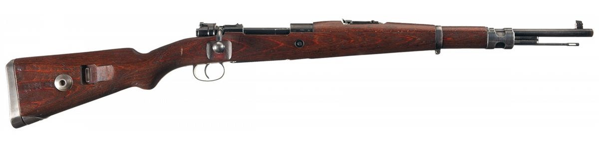 Produced in Czechloslovakia during the occupation. Blade front and tangent rear sights, with "dot/1942" on the chamber "G.33/40" on the receiver wall and a turned bolt handle. Milled front band and stamped rear, with "GERM" export mark stamped on the milled triggerguard assembly ahead of the floorplate. Smooth stock with the distinctive extended cupped buttplate, matching number on the underside, and faint WaA stamps. Matching serialized bolt.