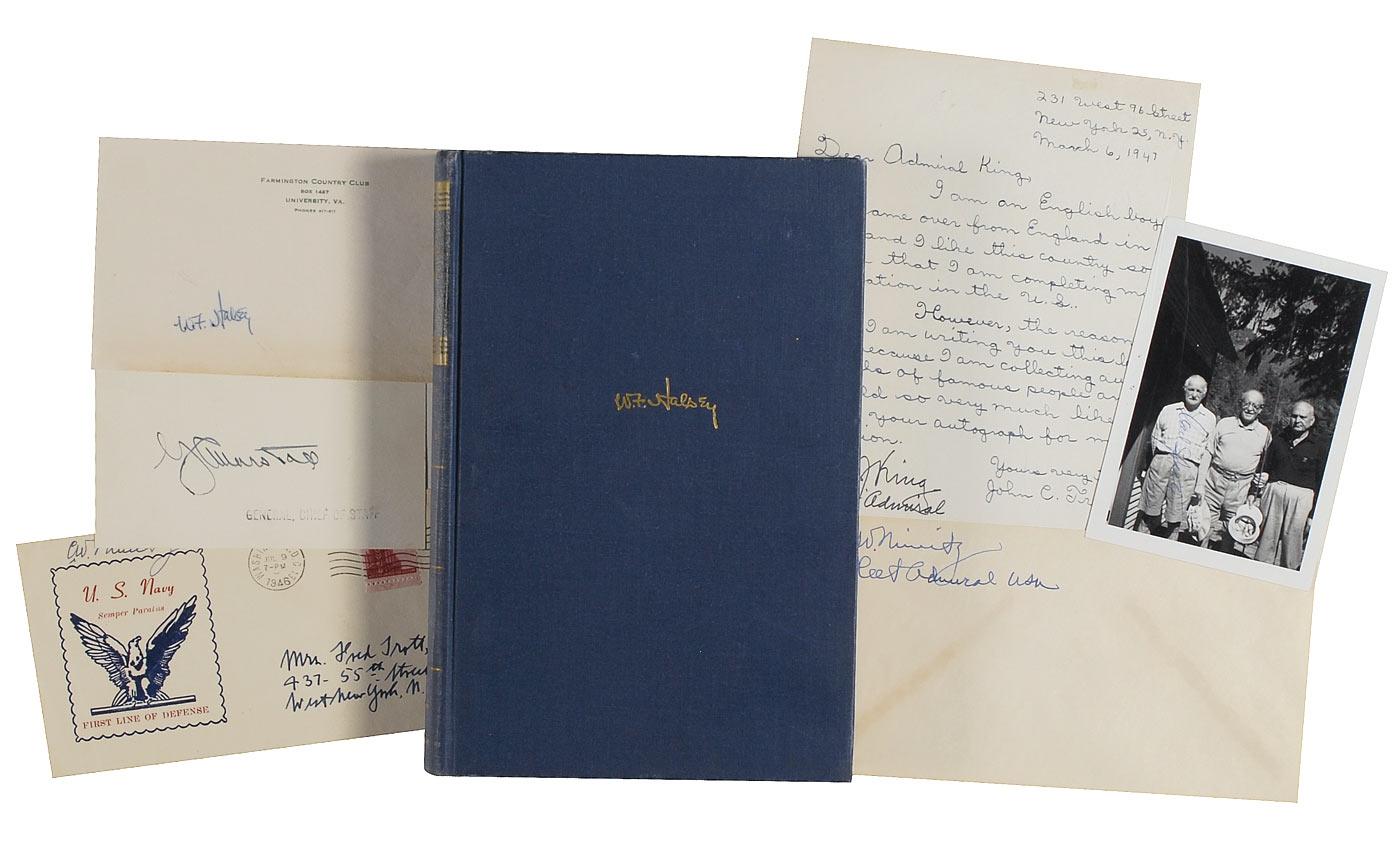 Seven items: fountain pen signature of George Marshall on a 5 x 3 card; fountain pen signature of William F. Halsey on a sheet of stationery from the Farmingham Country Club in Virginia as well as on a 5 x 3 card tipped into half title page of a hardcover volume, Admiral Halsey’s Story; fountain pen signature of Ernest J. King at the bottom of a piece of fan mail; commemorative postal cover signed by Chester W. Nimitz as well as on a postally unused envelope; and a 3.5 x 5 glossy snapshot signed in ink by Carl Spaatz. In overall very good condition with mild toning.