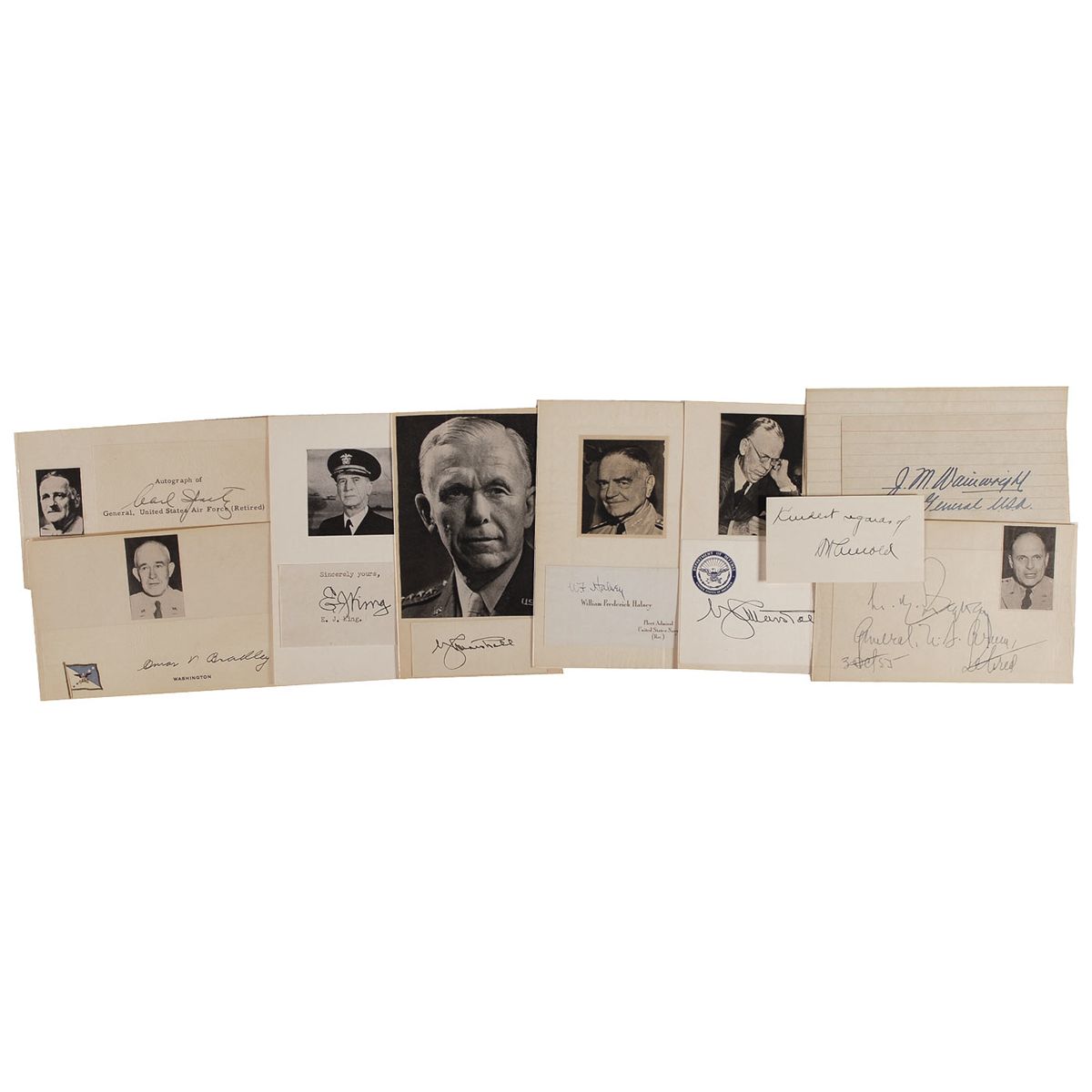 Twelve ink signatures of World War II veterans on individually clipped sheets and cards, affixed to slightly larger cards with small clipped photos of the respective officer. Signers are: Douglas MacArthur, George Marshall (2), Matthew Ridgway, E. J. King, Omar Bradley, Lucius Clay, Carl Spaatz, J. A. Doolittle, W. F. Halsey, Hap Arnold, and J. M. Wainwright. In fine condition, with scattered light toning.