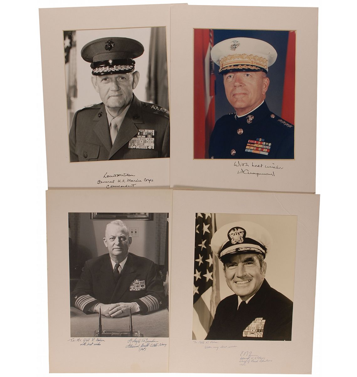 Four glossy or matte-finish photos, one color, each 7.5 x 9.5 and mounted or matted to an overall size of 11 x 14, and signed on the mount in blue or black ink. Signers are Louis H. Wilson, Jr., Arleigh Burke (ins), Elmo Zumwalt (ins), and Leonard F. Chapman, Jr. In overall fine condition.