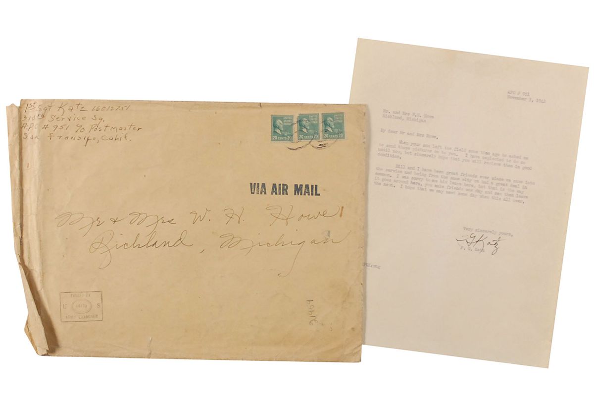 Rare and colorful dinner menu program for a Christmas feast to be held at Pearl Harbor’s General Mess at Hickam Field on December 25, 1941, 8.5 x 11, 20 pages. First two pages feature holiday greetings from Major General Frederick L. Martin and Brigadier General Jacob H. Martin, and the centerfold features an image of 167 soldiers posed in front of a bomber, captioned “Headquarters and Headquarters Squadron, 18th Bombardment Wing, Air Corps—Hickam Field, T. H.,” with their names listed below. Of those listed, 17 were killed at Hickam Field on December 7, 1941: Pvt. Garland C. Anderson, Pvt. Manfred C. Anderson, Pvt. Gordon R. Bennett, Jr., Pvt. Frank G. Boswell, Pvt. Frank B. Cooper, PFC John E. Cruthirds, Pvt. Robert C. Duff, Jr., Pvt. Lyle O. Edwards, Pvt. Russell E. Gallagher, PFC James E. Gossard, Jr., 1st Lieut. John S. Greene, Pvt. Theodore A. Joyner, PFC Durward A. Meadows, Cpl. La Verne J. Needham, Jr., Pvt. George J. Smith, Pvt. Paul L. Staton, and PFC Anderson G. Tennyson. In fine condition, with a few creases. Accompanied by a TLS by Sgt. F. G. Katz, November 3, 1942, sent to the family of one of the survivors.