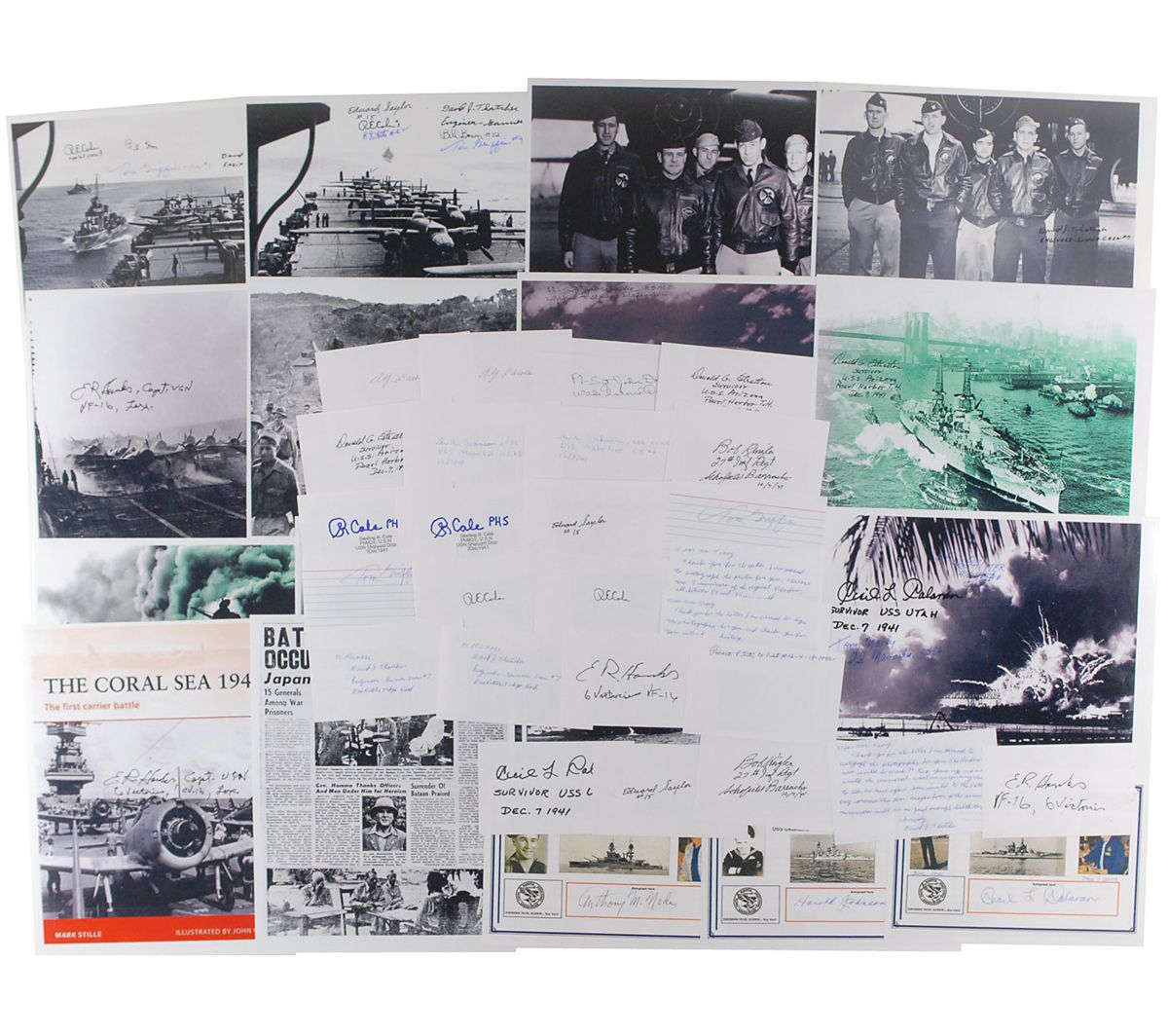 Collection of 49 items, consisting primarily of signed photos and signatures, each signed by a World War II participant. Signers are: Cecil Calavan (5), Sterling Cale (3), R. E. Cole (3), John Dale, Thomas Griffin (2), Ralph Hanks (4), Robert L. Hite (3), Fred Johnson (5), Harold Johnson, Bob Kinzler (2), Alf Larson (5), Anthony Nady, Edward Saylor (2), Donald G. Stratham (5), David Thatcher (5), and two photos signed by members of Doolittle’s Raiders.