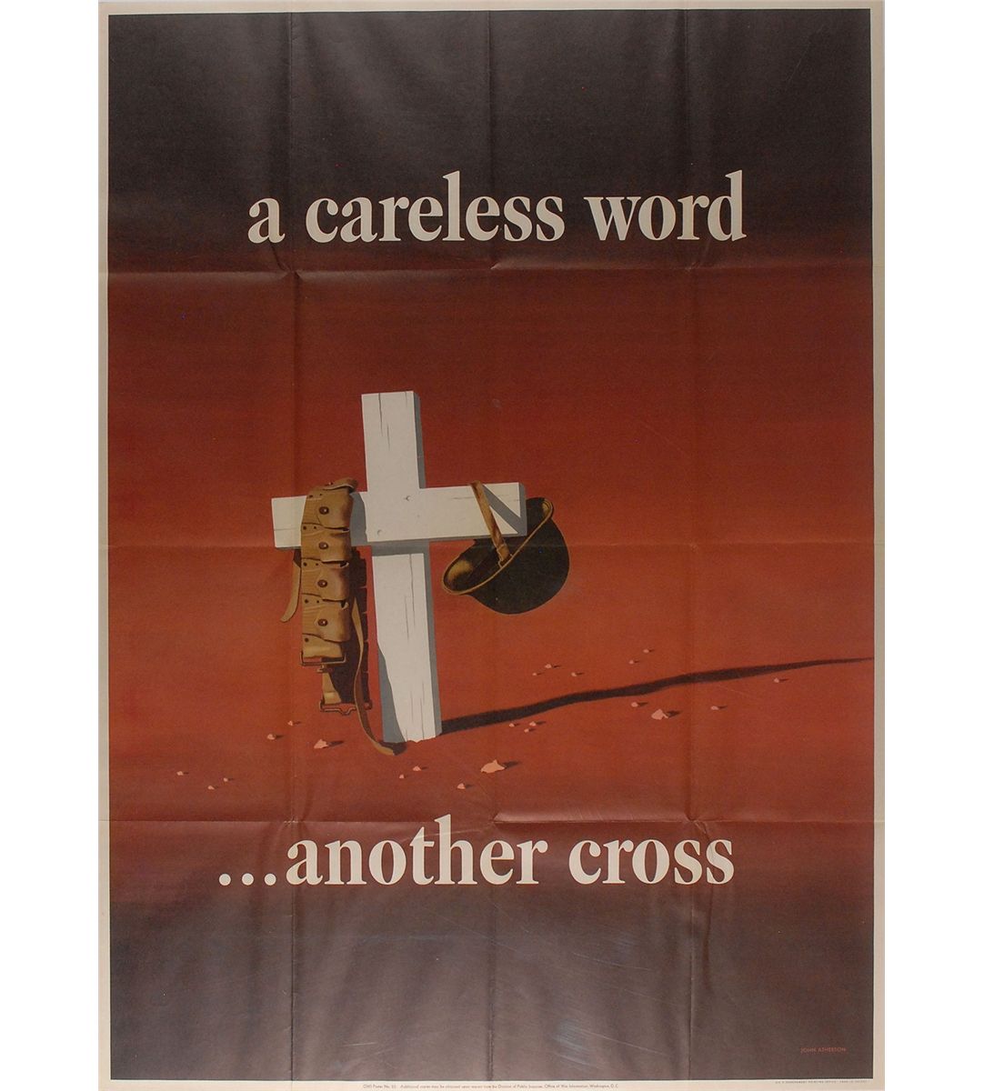 Original color 28.5 x 40 World War II propaganda poster, OWI No. 23, with art done by John Atherton, showing a single GI's grave, with its white cross holding his helmet and utility belt, with “A careless word…another cross” printed along the top and bottom. Printed in the lower border is “U.S. Government Printing Office: 1943-O-501237.” In fine condition, with expected storage folds.