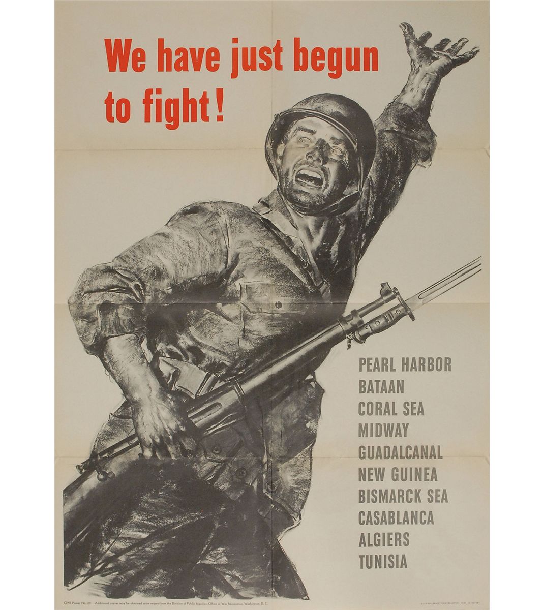Original color 20 x 28 World War II patriotic poster from 1943, OWI No. 62, showing a GI with drawn bayonet urging his fellow soldiers onward. Ten battles are listed at lower right, from Pearl Harbor to Tunisia. Printed in the lower border is “U.S. Government Printing Office: 1943-O-527284.” In fine condition, with expected storage folds.