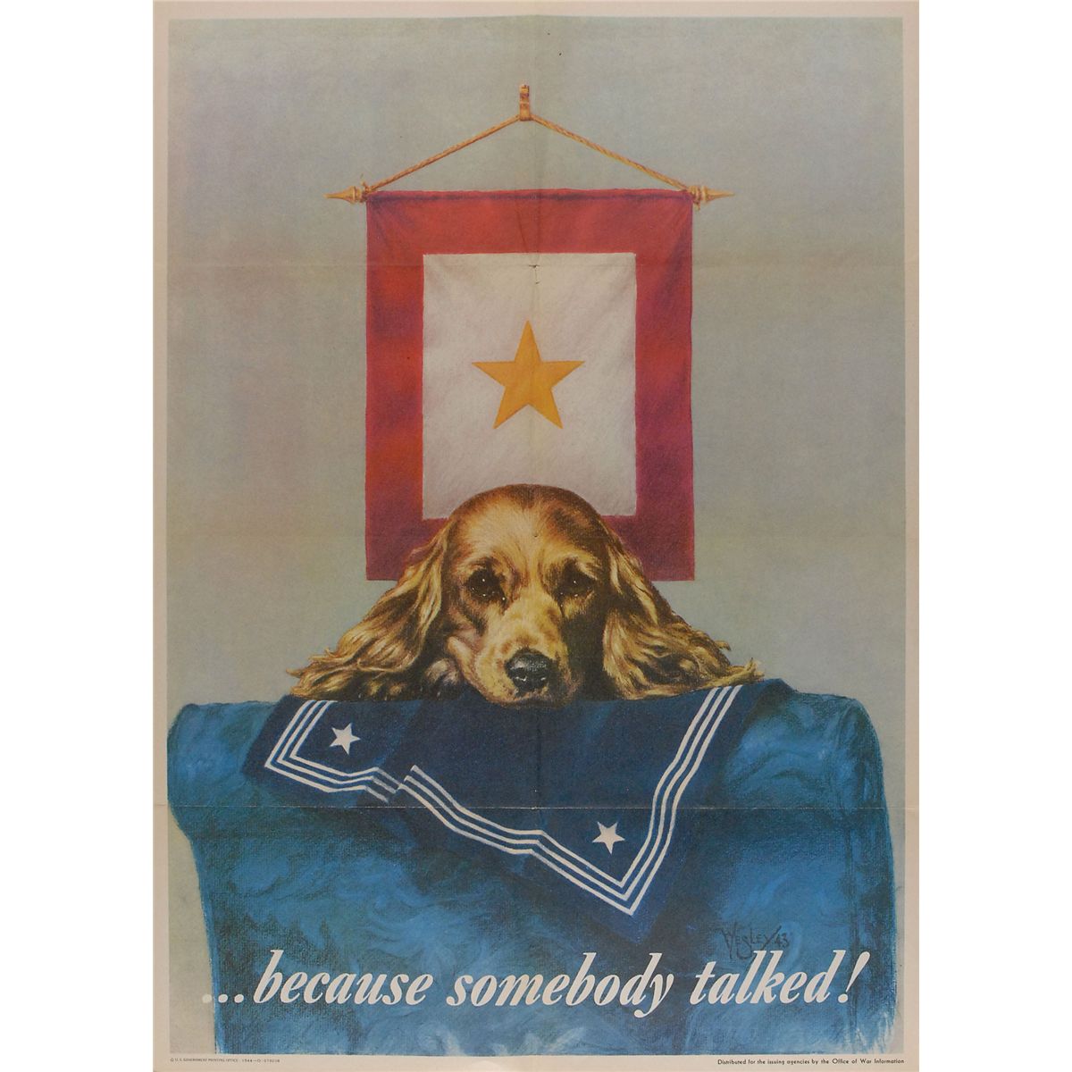 Heartbreaking original color 20 x 28 World War II patriotic poster from 1944, with art done by Wesley Heyman, showing a cocker spaniel in mourning over a lost owner. Printed at the bottom is “U.S. Government Printing Office: 1944-O-579038.” In fine condition, with expected folds, a couple of small wrinkles to right edge, and one small separation at intersection of two of the folds.
