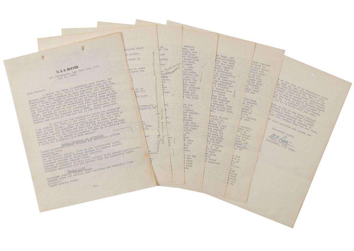 War-dated TLS signed “M. N. Little,” seven pages, 8 x 10.5, USS Beaver letterhead, May 15, 1942. Letter to Captain J.W. Bunkley, USN, at the Naval Medical Center in Bethesda, Maryland. Commander Little outlines what was done on the “California” after the attack on Sunday, December 7, 1941, day by day, to Thursday, December 11, 1941. In part, “Sunday forenoon and afternoon. Closed watertight doors, hatches and ventilation systems remaining open. Fought fire. Ran additional mooring lines to the interrupted quays. Rigged suction hoses through hatches to flooded spaces. Evacuated wounded to shore base hospital. Rescued personnel trapped below. Organized personnel to keep AA battery fully manned continuously. Procured ammunition for the battery from the ammunition depot…When the attack struck us we were moored fore and aft to the interrupted quays with eight lines, a bow wire, stern wire, forward bow spring, after bow spring, bow breast, forward quarter spring, after quarter spring and quarter breast…We fought the fire using hoses from the tugs, oil barge and mine sweeps alongside, plus chemical extinguishers, both CO2 and foam type, supplied from our own ship, the Base Force and the Yard. We were careful in our use of the hoses because of the fact that all water entering the ship immediately ran to the low side, thereby greatly increasing the capsizing moment…I am sorry that I have no idea how many bodies were removed from the ship before she settled. The work of removal was done I believe on Monday and/or Tuesday and I gave it no more than passing attention as I saw that bodies were being carried out.” Some scattered light toning and edge wear and two punch holes to top edges, otherwise fine condition.