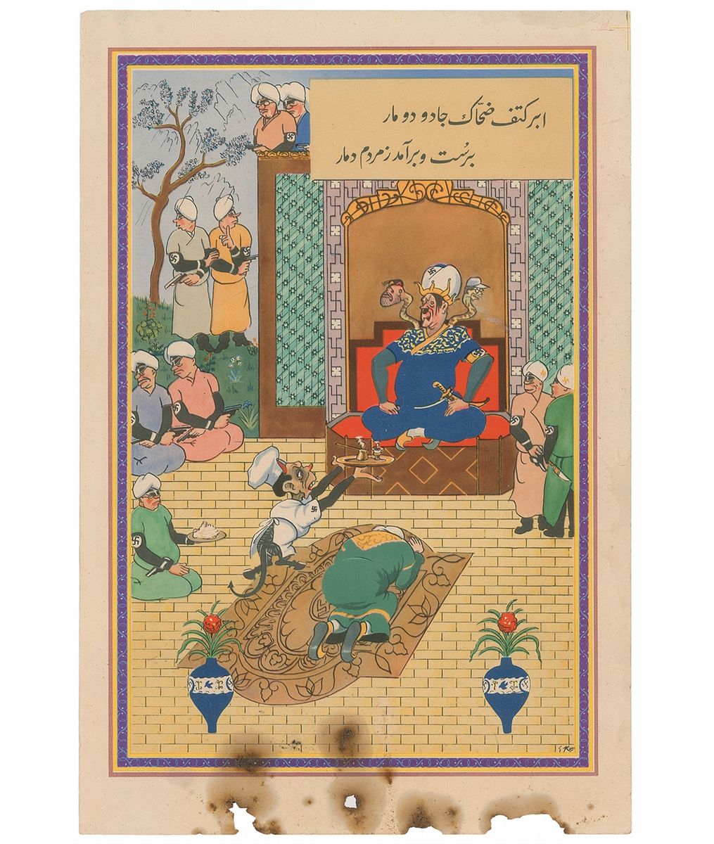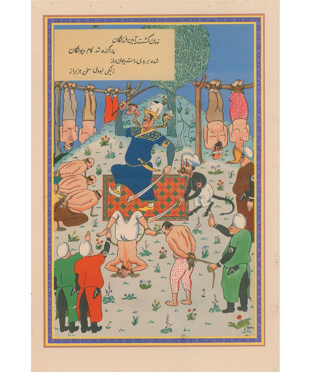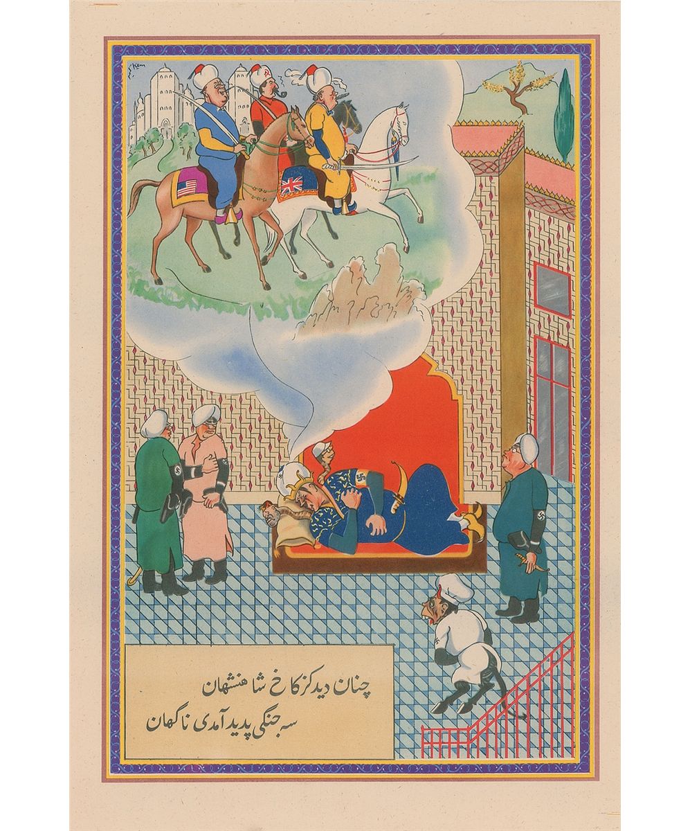 Collection of five color 1943 World War II propaganda leaflets, each measuring 13.5 x 9, done by British artist Kimon Evan Marengo for the British Ministry of Information, each with Persian/Farsi text in a square contained in the poster, and the artist’s printed initials in one corner of each poster. These five posters tell the story of Hitler, by adapting it to the five scenes from the Shahnameh of Ferdowski. Hitler is depicted as the mythical figure Zahak, an evil king who had two snakes (drawn here with the faces of Mussolini and Tojo) growing out of his shoulders. KEM prepared the posters between March and October 1942 to coincide with the Teheran Conference, held in Iran between November 28–December 2, 1943, at which was he was an official observer. During the conference, Roosevelt, Churchill, and Stalin signed a Declaration on Iran that committed the three powers to Iran's independence. In very good condition, with some scattered light wrinkling and toning, as well as scattered dampstaining. Egyptian-born and Oxford-educated, KEM produced some 3000 anti-Nazi propaganda drawings for the British Ministry of Information during World War II. His fluency in European and Middle Eastern languages made his artwork especially useful for wartime distribution in Algeria, Morocco, Egypt, and Iran, where fear of German influence had prompted British and Russian occupation of the oil-rich country.
