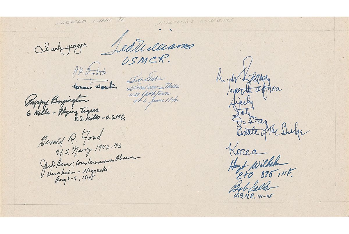 Highly unusual assemblage of felt tip and ballpoint signatures on an off-white 14 x 8 card, featuring 11 famous military veterans from a variety of fields, including: Gerald R. Ford, Ted Williams, Hoyt Wilhelm, Bob Feller, Chuck Yeager, James H. Doolittle, Pappy Boyington, Jacob Beser, Bob Elder, Matthew Ridgeway, and Herman Wouk. Most add rarely seen notations regarding their service, including Ford adding “U. S. Navy 1942–46,” and Ted Williams adding “USMCR.” In fine condition.