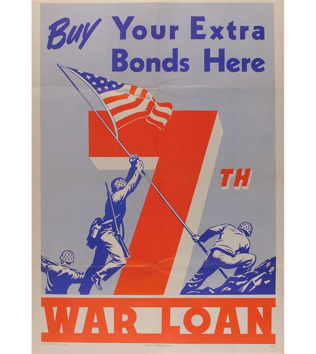 Original color 20 x 28 World War II patriotic poster from 1945 encouraging the purchase of war bonds, with an image of the Iwo Jima flag raising, with “Buy your extra bonds here,” printed along the top. Printed along the bottom edge is “U.S. Government Printing Office: 1945-O-638317.” In fine condition, with expected storage folds and some light toning to borders.