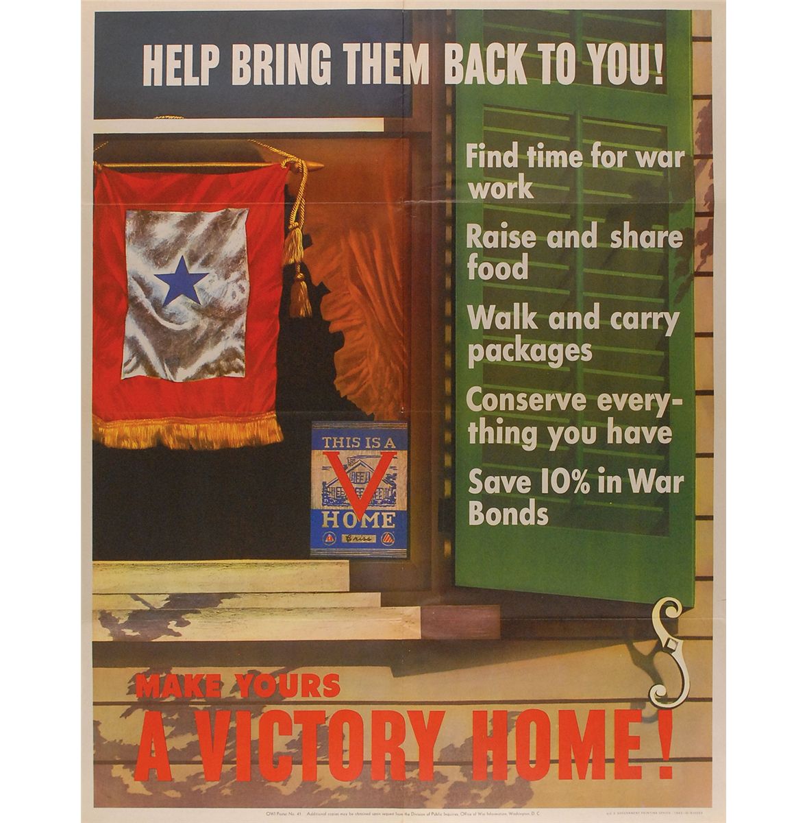 Original and very colorful 22 x 28 World War II patriotic poster from 1943, O. W. I. 41, with artwork by Francis Hyman Criss, showing a blue star flag in a house’s window, with “Help Bring Them Back To You,” and “Make Yours A Victory Home,” printed along the top and bottom. Printed along the bottom edge is “U.S. Government Printing Office: 1943-O-510253.” In fine condition, with expected storage folds.