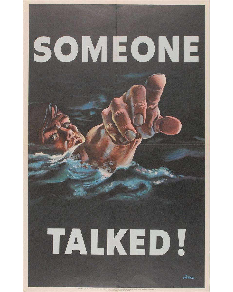 Original color 14 x 22 World War II patriotic poster from 1942, O. W. I. 18, with artwork done by Fred Siebel, showing a man struggling to stay afloat in a body of water, with “Someone talked!,” printed along the top and bottom. Printed along the bottom edge is “U.S. Government Printing Office: 1942-O-496733.” In fine condition, with central horizontal and vertical folds and a few corner tip creases.