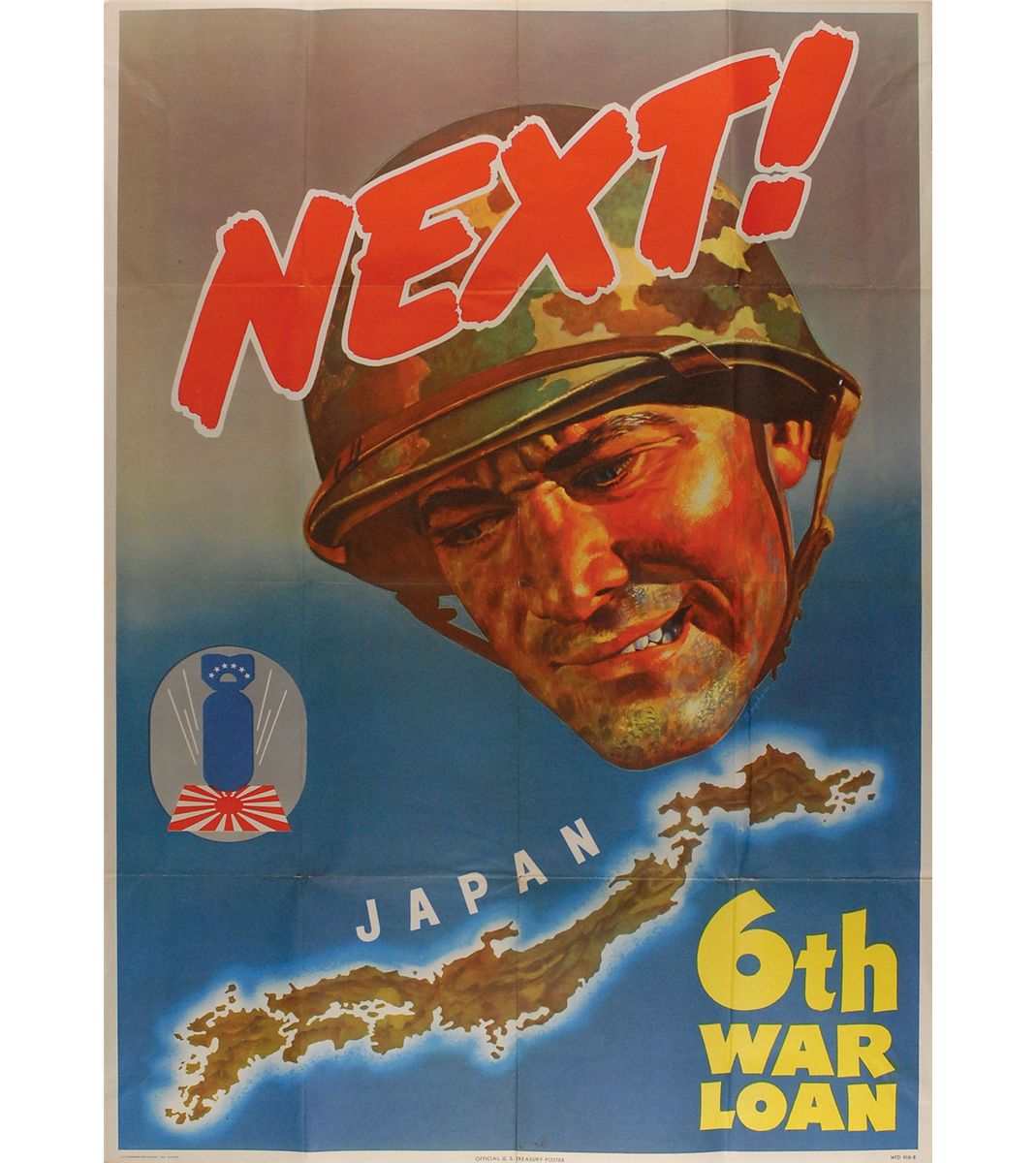 Original color 28.5 x 40 World War II 6th war loan patriotic poster from 1944, with artwork done by Bingham, showing a grimacing G.I. sneering down at the island nation of Japan, with an inset blue bomb logo hurtling towards a Japanese flag, with “Next! Japan,” printed in the center. Printed along the bottom edge is “U.S. Government Printing Office: 1944-O-610930.” In fine condition, with a few small separations along storage folds, and some light toning to borders. Oversized versions of this poster are seldom encountered.