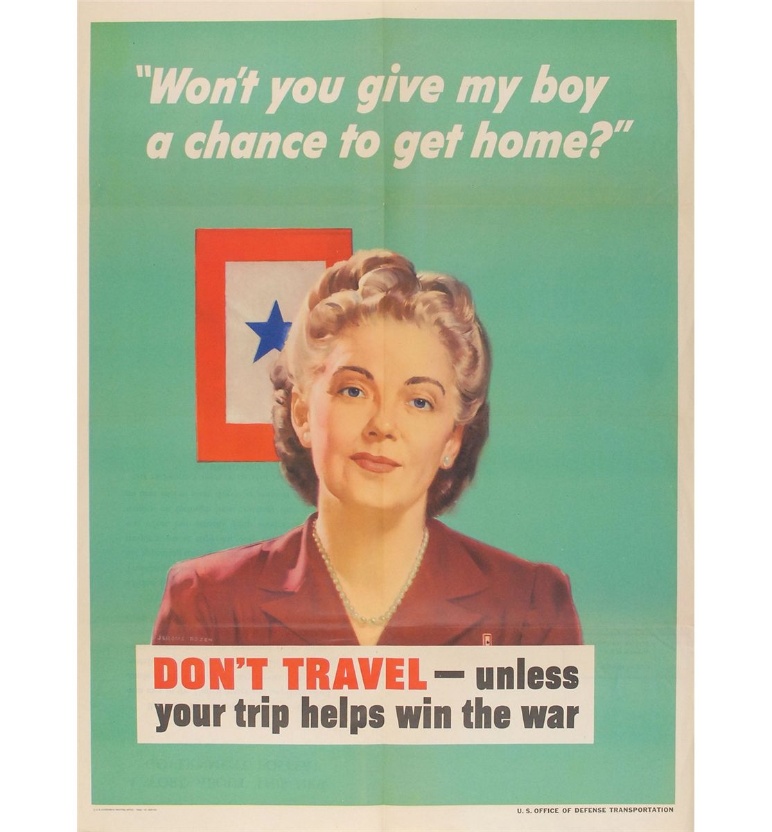 Original color 20 x 26.5 World War II US Department of Defense Transportation patriotic poster from 1944, with artwork done by Jerome Rozen, showing a matronly woman in front of a blue-star flag, with “Don’t travel—unless your trip helps win the war,” printed at the bottom. Printed along the bottom edge is “U.S. Government Printing Office: 1944-O-606790.” Additional government information is printed on the reverse. In fine condition, with intersecting storage folds.