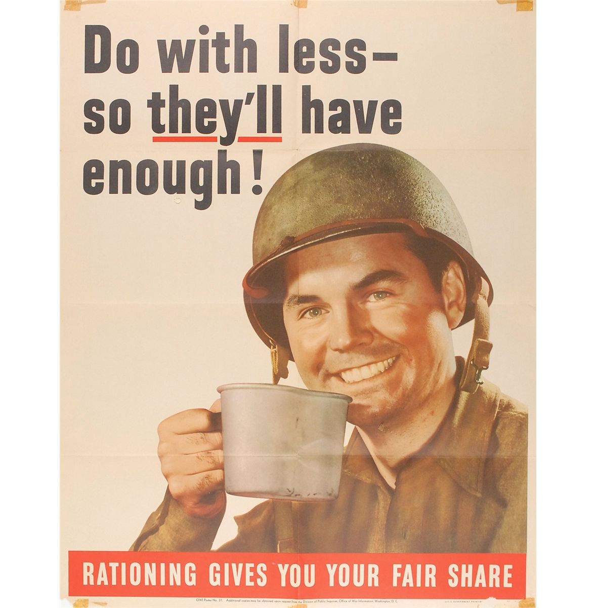 Original color 22 x 28 World War II patriotic poster from 1944, O. W. I. 37, showing a soldier smiling and holding a large metal cup, with “Rationing gives you your fair share,” printed along the bottom. Printed along the bottom edge is “U.S. Government Printing Office.” Old tape to edges, missing lower left corner tip, and some light surface loss along bottom edge affecting the government printing, otherwise fine condition.