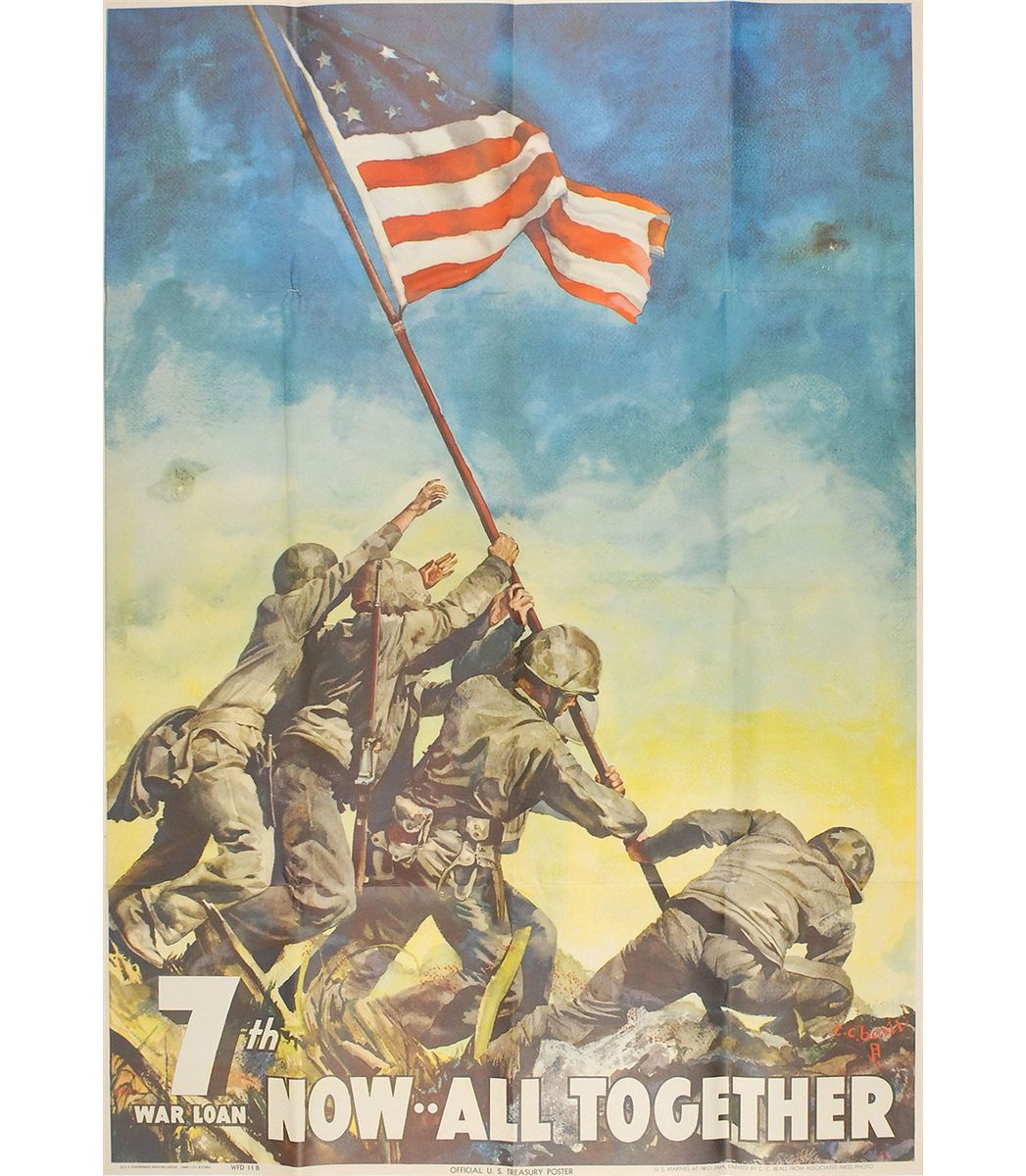 Outstanding original color 26 x 36 World War II poster from 1945, showing the iconic image of the Iwo Jima flag raising, with “7th War Loan Now…All Together,” printed below the image. Printed at the bottom is “U.S. Government Printing Office: 1945—O-637980.” In fine condition, with expected storage folds.