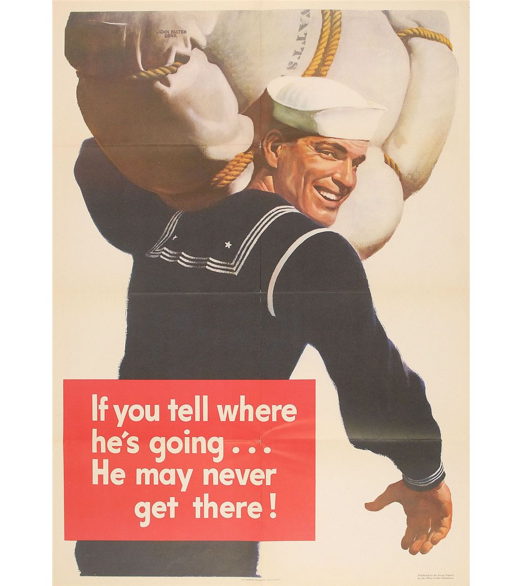 Original color 20 x 28 World War II patriotic poster from 1943, showing a sailor carrying a large pack over his shoulder, with “If you tell where he’s going…He may never get there!,” in a box below the image. Printed at the bottom is “U.S. Government Printing Office: 1943—O-556153.” Expected storage folds and a couple partial separations, otherwise fine condition.