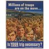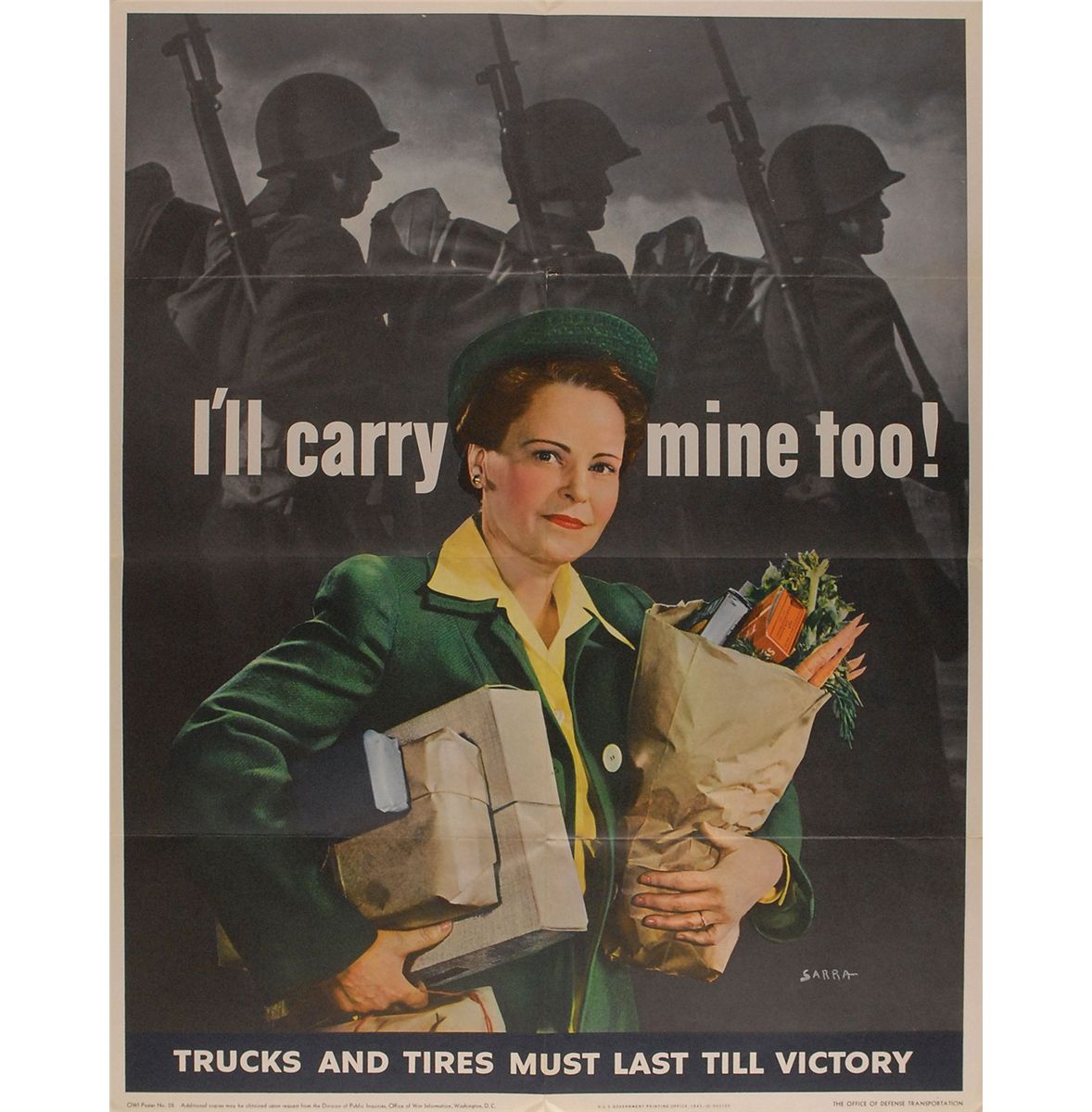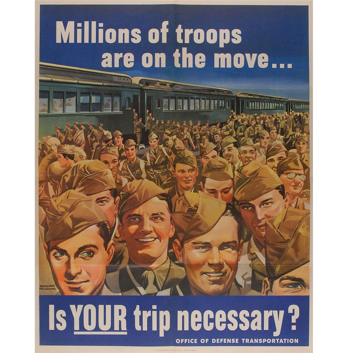 Collection of four original color World War II posters from 1943-1944, ranging in size from 16 x 22.5 to 22 x 28. The first shows two men working together building an airplane and reads, “United we win”; the second shows a table setting with only bones left on the plate and reads, “Food is a weapon, don’t waste it”; the third shows a woman carrying her groceries as soldiers in the background march off to war, and urges the conservation of trucks and tires; and the fourth shows a train unloading hundreds of soldiers and asks, “Is your trip necessary?” In overall fine condition, with expected horizontal and vertical folds (with a few separations) and some old tape toning and surface loss along bottom edge of the “United we win” poster.