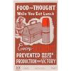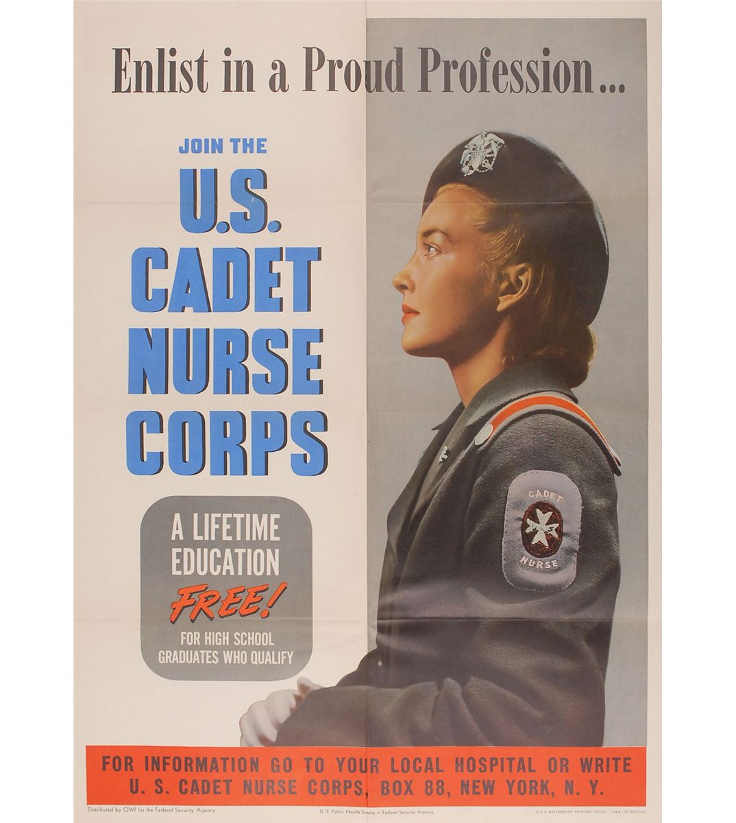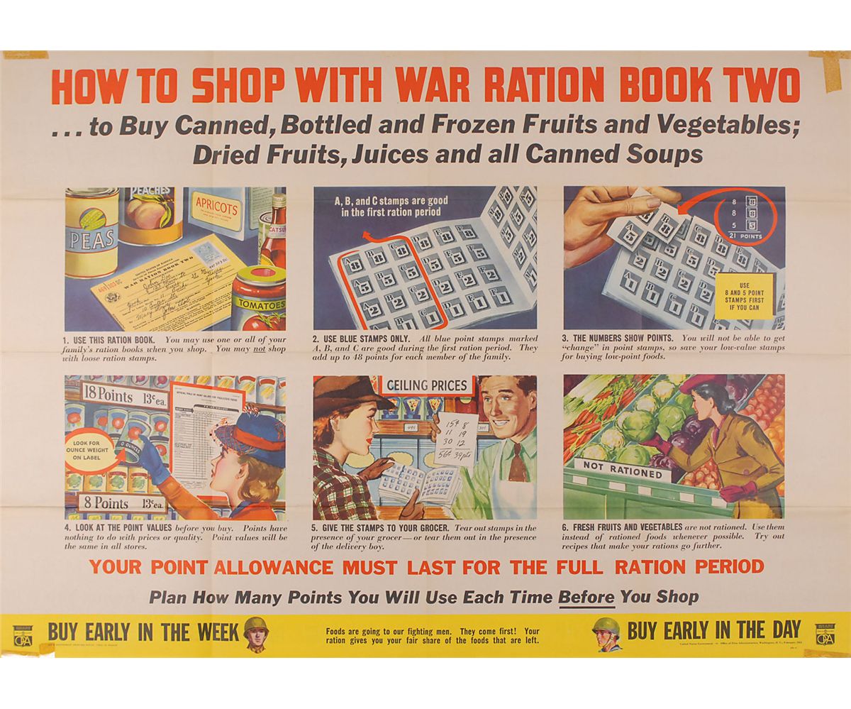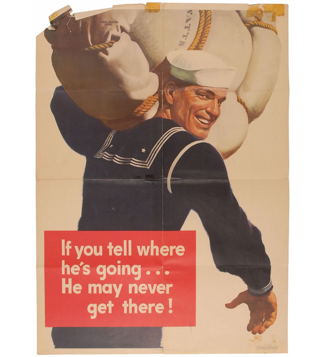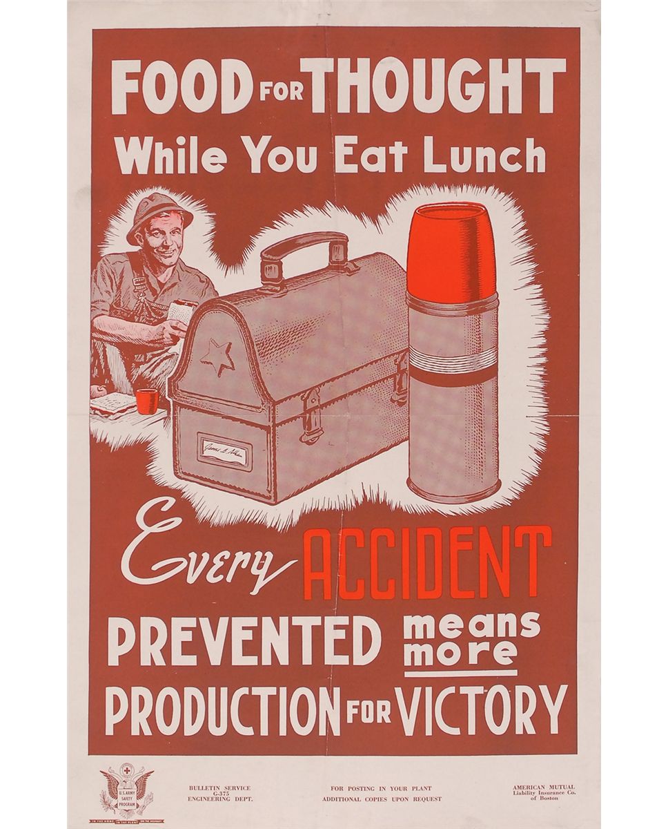Collection of four original World War II posters from 1943 (one undated), ranging in size from 11 x 17 to 40 x 28.5. The first shows a worker on his lunch break and reads, “Food For Thought While You Eat Lunch…Every Accident Prevented means more Production For Victory”; the second illustrates step-by-step directions on “How To Shop With War Ration Book Two”; the third shows the profile of a young nurse in uniform, encouraging enlistment in the US Cadet Nurse Corps; and the fourth shows a sailor carrying a large pack over his shoulder and reads, “If you tell where he’s going…He may never get there!” The first three posters are in overall fine condition, with expected storage folds (with a few separations) and some old tape toning; the sailor poster is in very good condition, with several toned tape remnants; tears and creases along upper edge, with one corner missing, and larger separations to folds.