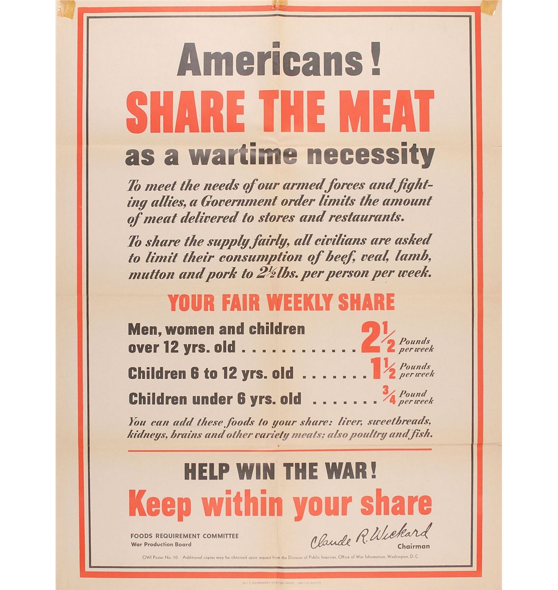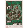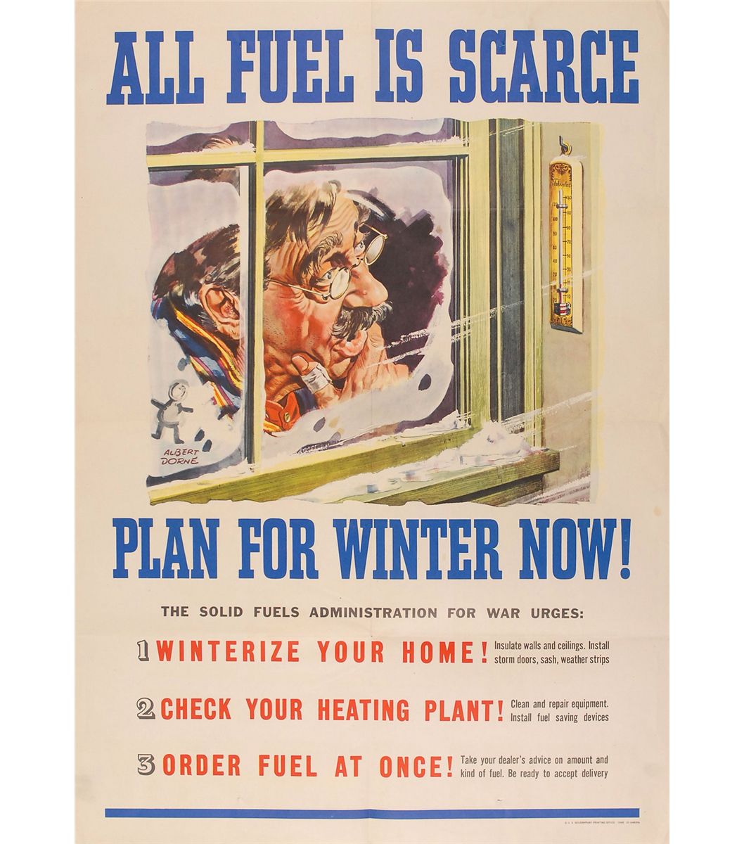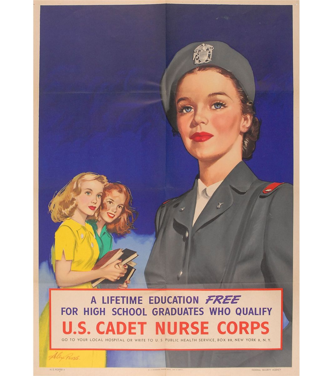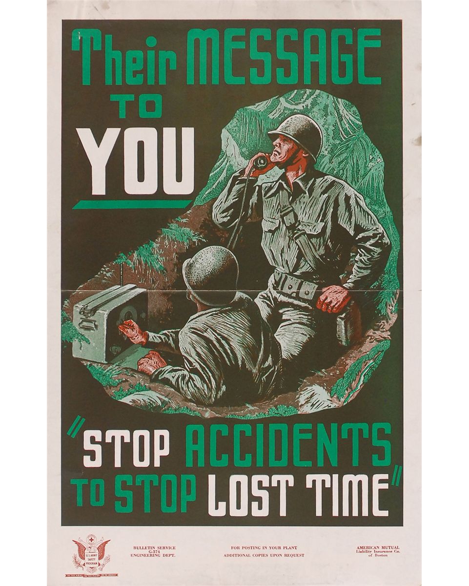 Collection of four original color World War II posters from 1942–1945 (one undated), ranging in size from 11 x 17 to 21 x 28. The first shows two school girls looking at a nurse in uniform, encouraging enlistment in the US Cadet Nurse Corps; the second shows a man looking out his frozen window and reads, “All fuel is scarce / Plan for winter now”; the third announces a Government-imposed weekly consumption plan for meat products; and the fourth shows two soldiers in a fox hole attempting to deliver a radio message, reading, “Their Message To You…Stop Accidents To Stop Lost Time.” In overall fine condition, with expected storage folds (with small separations), some toned tape to edges, and two tack holes to the top corners of the nurse poster.