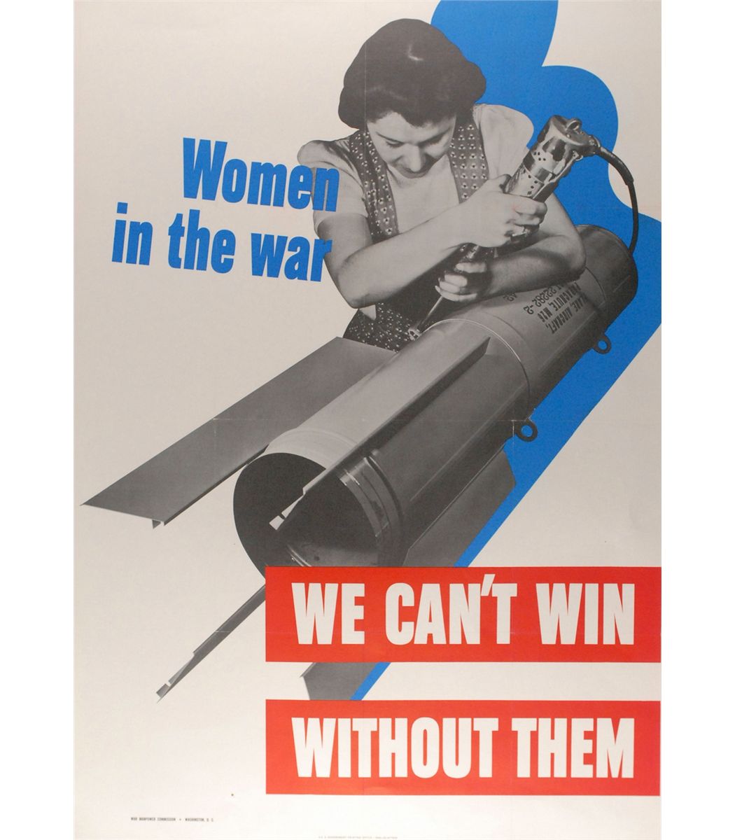 Collection of three original color World War II posters, all from 1942, and ranging in size from 20 x 28 to 28 x 40. Titles are: ‘We Can’t Win Without Them,’ picturing a woman working to assemble an AN-M26 parachute flare; ‘Say Yes! Take your change in War Stamps,’ featuring faces of three military men; and ‘Wanted—Fighting Dollars,’ showing an American citizen holding a war bond. Accompanied by four identical 7.5 x 11 World War I newspaper art supplement posters with vivid patriotic Howard Chandler Christy artwork. World War II posters are professionally linen-backed and in overall fine condition.