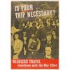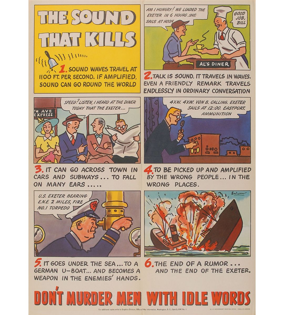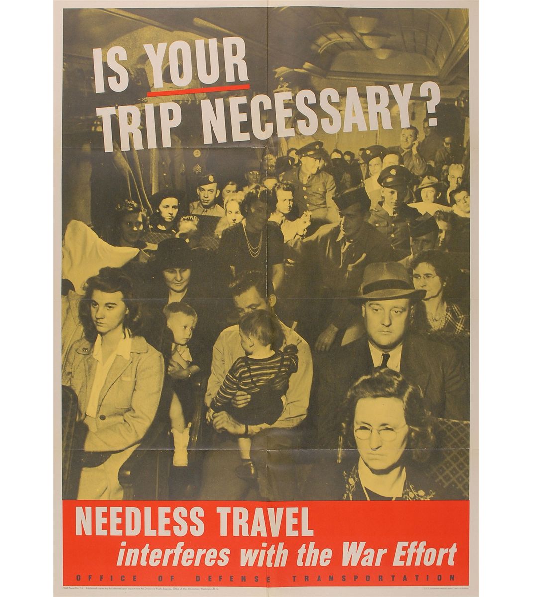Collection of four original color World War II posters from 1942–1946, ranging in size from 14.5 x 20 to 28.5 x 38. The first shows the Liberty Bell, Christmas holly and bells above a war bond, reading, “For Liberty and Peace on Earth,” above the image, and “Give War Bonds,” underneath; the second shows a crowded train car and asks, “Is your trip necessary?”; the third, entitled, “The Sound That Kills,” features an elaborate story board depicting the ease in which a careless remark can be used against the military effort; and the fourth is a message from President Harry Truman that encourages American citizens to follow a stricter eating regimen as a means to combat worldwide famine. In overall fine condition, with expected storage folds (with trivial separations).