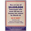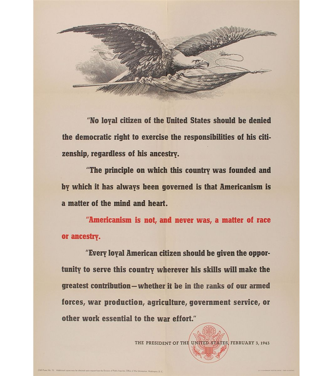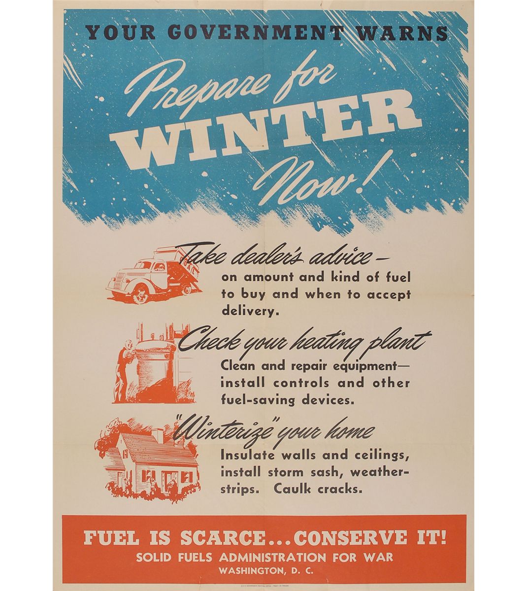 Collection of four original color World War II posters from 1943–1944 (one undated), ranging in size from 14.25 x 20 to 24 x 37.75. The first lists helpful ways in which citizens can conserve fuel during the cold months, with “Prepare for winter now!,” at the top; the second bears a message from the Treasury Department reminding citizens to get a head start on filing their income tax returns; the third features a lengthy quote from President Franklin D. Roosevelt on February 3, 1943, with a central portion bolded in red, “Americanism is not, and never was, a matter of race or ancestry,” and a bald eagle at the top; and the fourth is a Canadian poster, issued by the Wartime Information Board, which emphasizes workplace precision, with “Make it fit to fight” in large bold text. In overall fine condition, with expected storage folds (partial separations) and small edge tears.