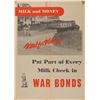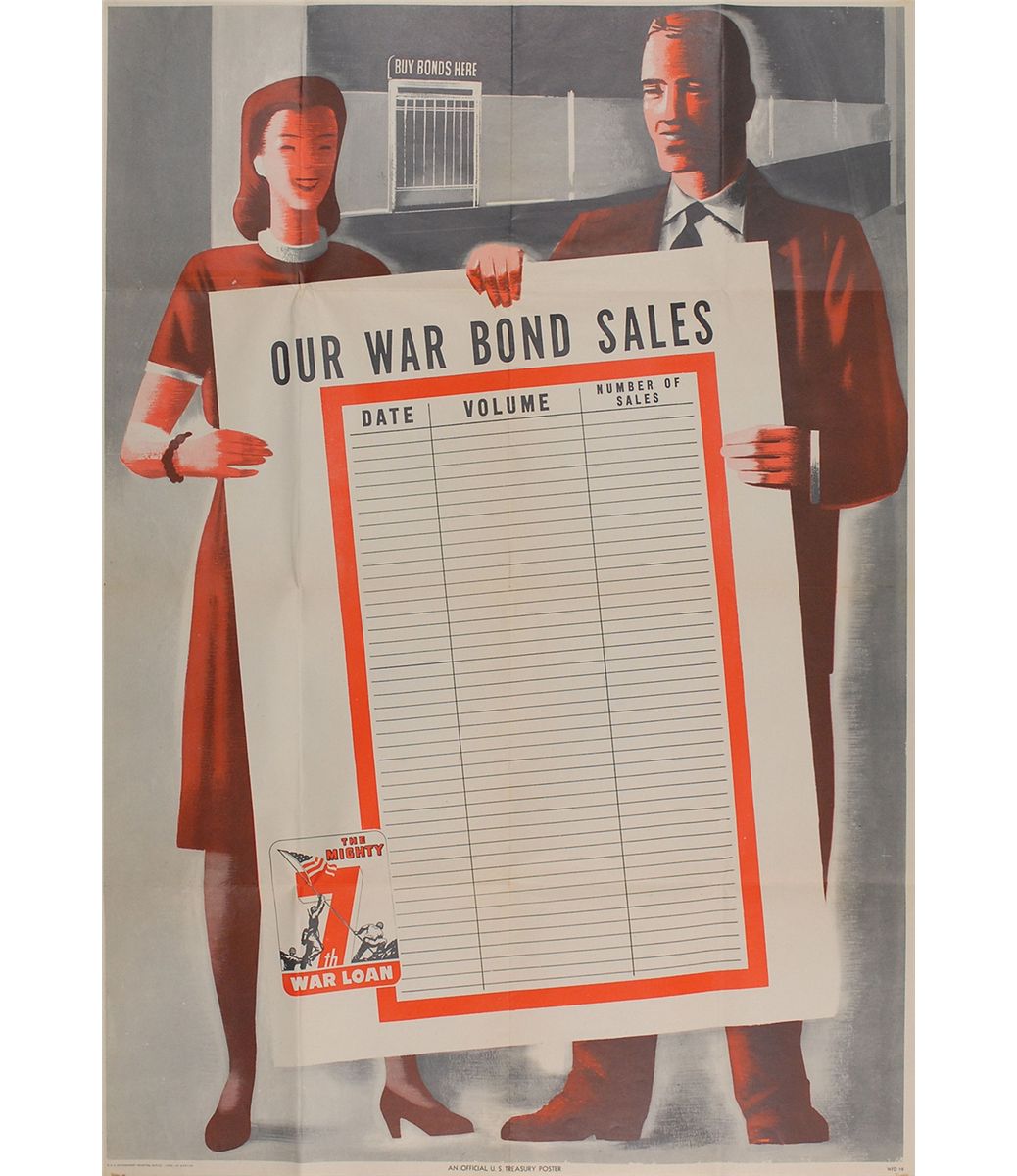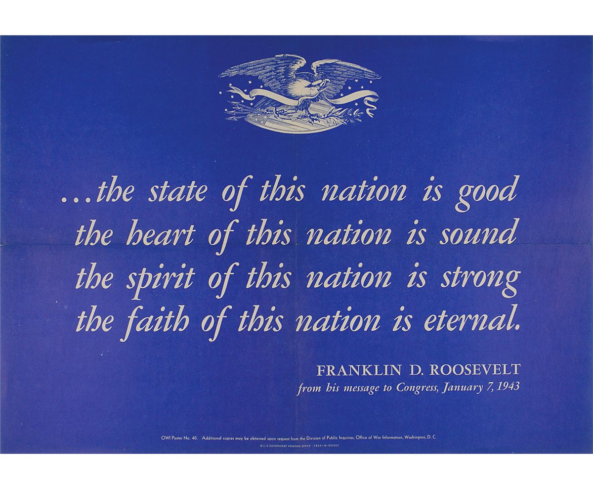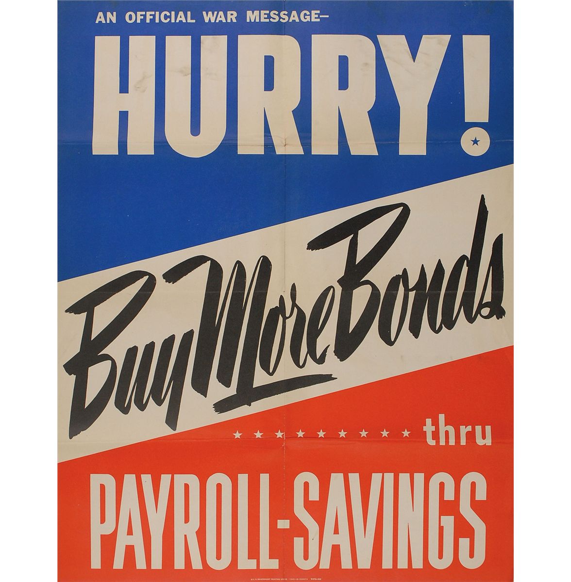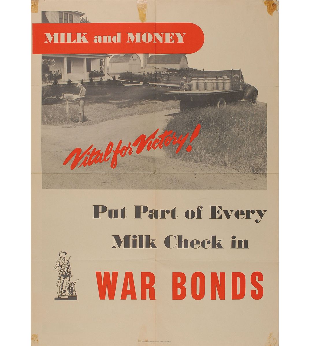 Collection of four original color World War II posters from 1943–1945, ranging in size from 20 x 14 to 25.75 x 37. The first features an enlarged photo of a dairy farm that advocates putting a portion of every milk check into war bonds, and reads, “Milk and money—Vital for Victory!”; the second is a Treasury Department poster which shows a man and woman holding up an unfilled office chart used for recording war bond sales; the third quotes a message from President Franklin D. Roosevelt to Congress on January 7, 1943 on a bold blue background; and the fourth is a patriotic-colored war message, reading, “Hurry! Buy More Bonds thru Payroll–Savings.” In overall fine condition, with expected storage folds, partial separations, and minor ink smudging, and toned tape remnants to top and bottom edges, with tack holes and some paper loss to top corners of the dairy farm.