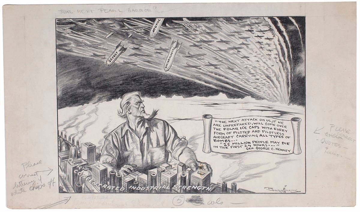 Fantastic World War II–era original cartoon artwork accomplished in graphite and ink on a 21 x 12 cardstock sheet, depicting the personified American “Concentrated Industrial Strength” fending off an attack of atomic, biological, and secret weaponry. A light pencil title at the top reads, “The Next Pearl Harbor?,” and a quote from Gen. George C. Kenney is penned in the lower right. Light scattered soiling, otherwise fine condition.