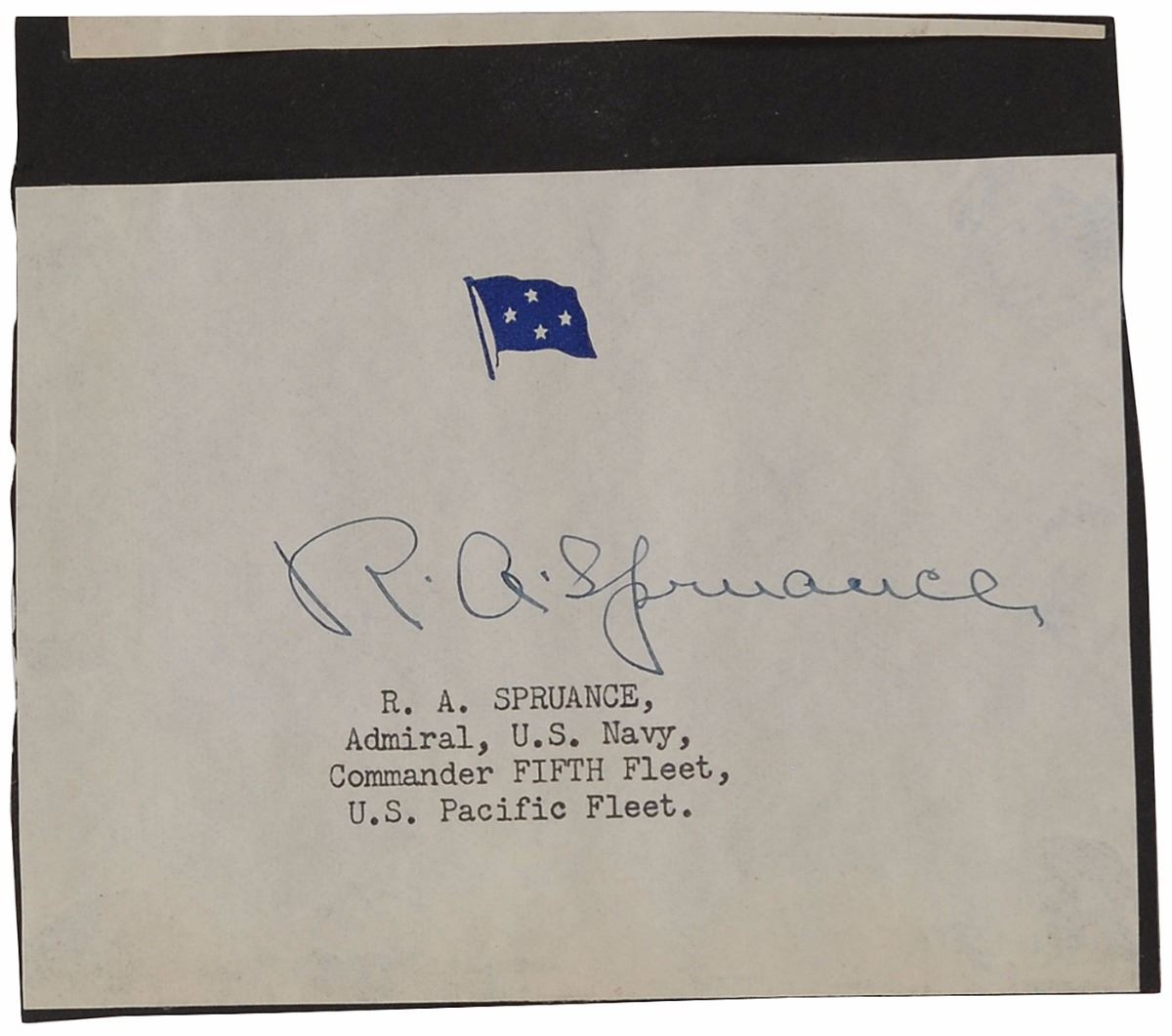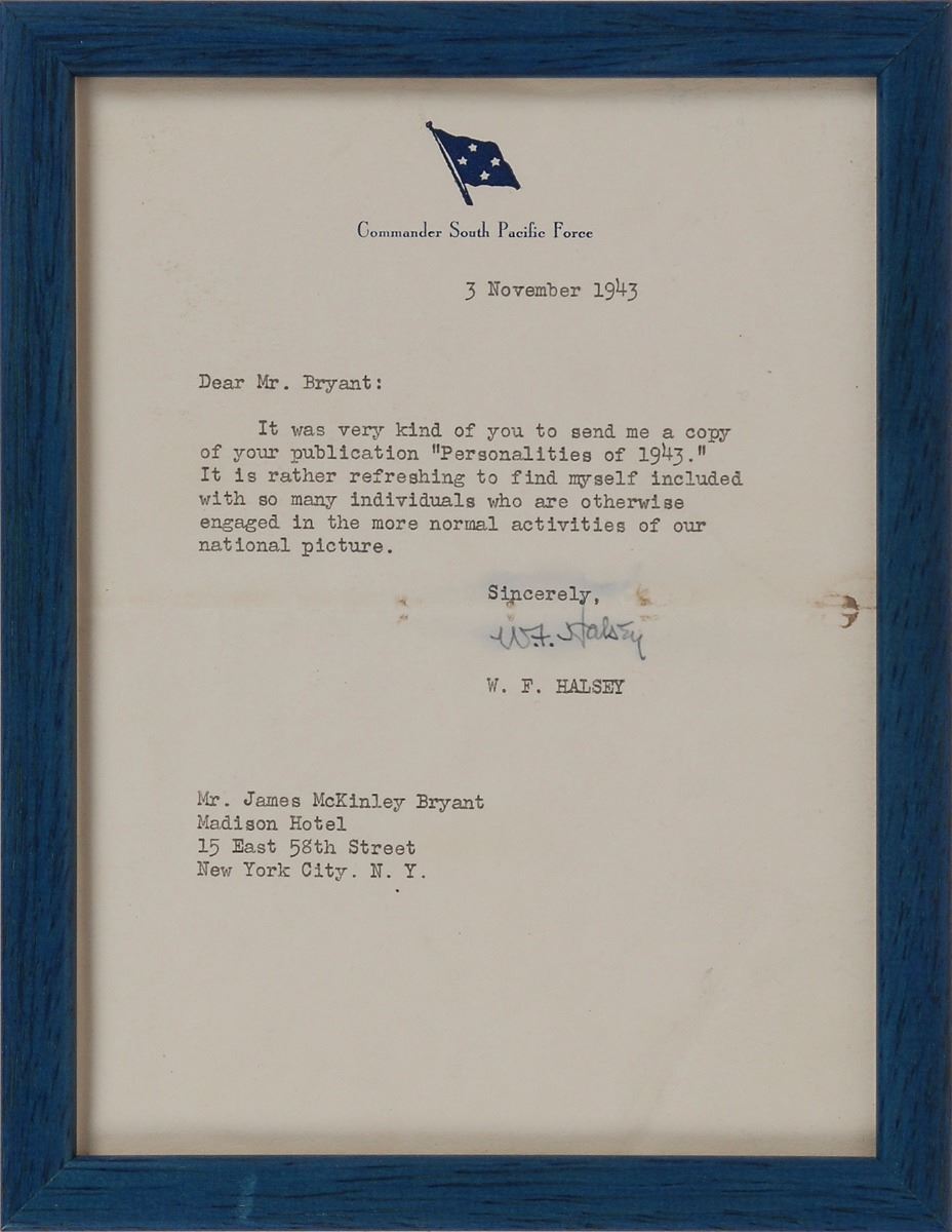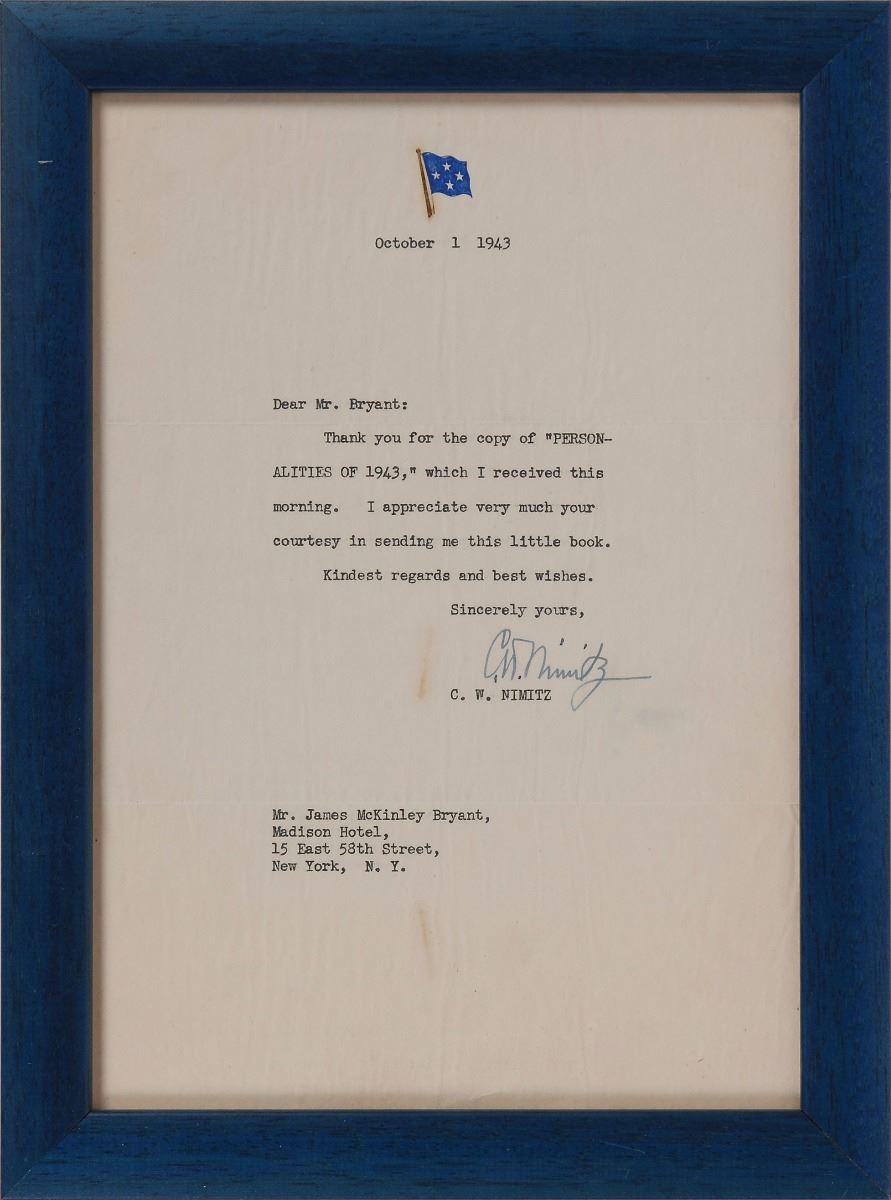 Three items: a TLS signed “C. W. Nimitz,” 6.75 x 9.75, Commander South Pacific Force letterhead, October 1, 1943, in full: “Thank you for the copy of ‘Personalities of 1943,’ which I received this morning. I appreciate very much your courtesy in sending me this little book”; a TLS signed “W. F. Halsey,” 5.75 x 7.75, Commander South Pacific Force letterhead, November 3, 1943, in full: “It was very kind of you to send me a copy of your publication ‘Personalities of 1943.’ It is rather refreshing to find myself included with so many individuals who are otherwise engaged in the more normal activities of our national picture”; and a fountain pen signature, “R. A. Spruance,” on an off-white 5 x 3.75 slip clipped from a letter. The two letters are framed, and the signature is affixed to a slightly larger sheet. In overall very good to fine condition, with bleeding to Halsey’s signature and some light stains to the Nimitz letter.