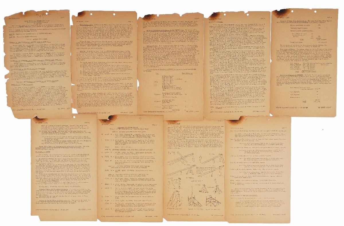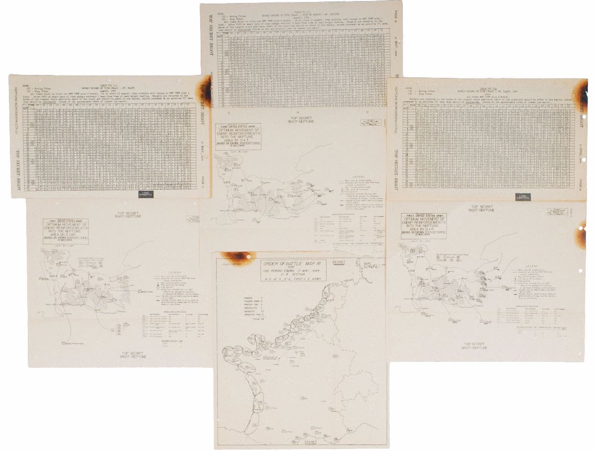 Rare mimeographed addendum document intended for insertion within the Neptune Monograph, twelve double-sided pages plus four maps, 8 x 13, headed: “Top Secret—Bigot. Naval Commander, Western Task Force, Intelligence Bulletin Number 1, 21 May 1944.” A fascinating Operation Overlord addendum prepared just two weeks before D-Day. The document contains special instructions summarized in section headers including, “Destruction of previously issued Omaha shoreline sketches.” It describes “Enemy E-Boat Tactics,” noting: “The most modern E-Boats carry both torpedoes and mines, and are expected to constitute the greatest surface threat to Operation ‘OVERLORD.’” Other topics reported on include small submarines and "human torpedoes," secret enemy weapons such as long-range rockets and "robot mines," the enemy army order of battle, underwater obstacles, the estimated enemy air force effort in the face of an invasion, and mines and obstacles to be expected on beaches. In very good to fine condition, with burn marks at upper left corners and areas of paper loss and chipping to edges (affecting no text). The main plan for Operation Overlord was constantly changing as new information and intelligence became available, with these pages reflecting revisions for the America sector in Western Normandy. The complexities of Operation Overlord and its successful execution make it one of the greatest feats of military strategy of the modern age. This original document is a testament to the thorough planning and enormous effort that went in to orchestrating the invasion.