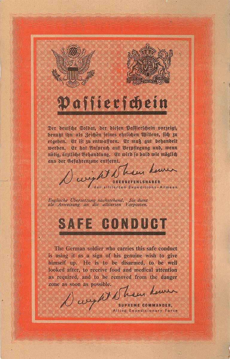 World War II-dated 'Safe Conduct' pass, 5.25 x 8.5, issued by the US Army and bearing two facsimile signatures of Allied Expeditionary Force Supreme Commander Dwight D. Eisenhower. The pass bears text in both German and English, and reads: "The German soldier who carries this safe conduct is using it as a sign of his genuine wish to give himself up. He is to be disarmed, to be well looked after, to receive food and medical attention as required, and to be removed from the danger zone as soon as possible." Reverse bears additional directions in German. In fine condition.