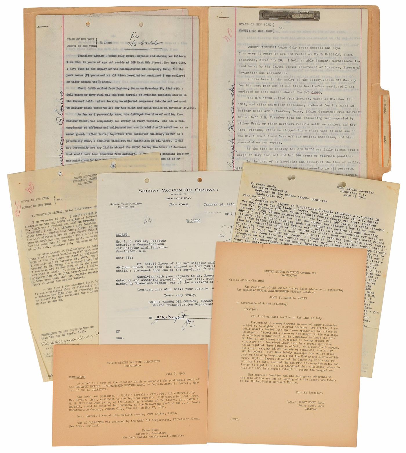 The USS William C. Gorgas was part of a convoy bound from New York to Liverpool when it was torpedoed on March 10, 1943. Sailor Preston Boyter relays his harrowing escape and subsequent rescues: “11:45 P. M. at the time Gorgas was attacked I was in my room…off watch at time the concussion threw me off my bed all lights went out at once. When I gained my feet my room was full of water the door to my room was jammed with steel locker and beds I found the door and rammed it open…I fell out the room into the passage way it was full of water steam and torpedo fumes…I heard someone calling for help I traced the call and found the chief cook in the deck engine room with the door jammed I grabbed a fireaxe and chopped open the door he was very thankful.” Boyter and other survivors boarded lifeboats and were soon recovered by the HMS Harvester, which, after losing power in its second propeller, was itself torpedoed by a U-boat that intersected the ship’s distress call. “I saw a torpedo that was surfaced and streaking across the water…the last torpedo hit some explosives blowing the ship in half also blow me back in the water I was dazed my head was bleeding…The rafts were overcrowded. There were about thirty men on a raft which ordinarily holds 15…We were then picked up by the H.M.S. Narcissis.” Also included are two documents related to a citation given to James F. Harrell, who was bestowed with the Merchant Marine Distinguished Service Medal for his courage in rescuing 106 survivors of a torpedoed Dutch ship. In overall very good to fine condition.