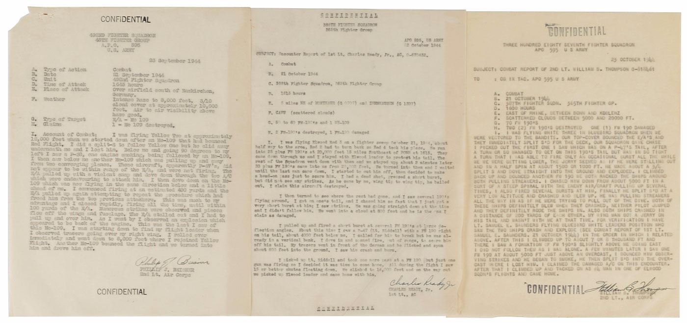 Three typed American combat reports from WWII, each signed by the associated fighter pilot, one page, all marked "Confidential," including: a report signed "Philip J. Beisner," September 23, 1944, in part: "I was flying Yellow Two at approximately 12,000 feet when we started down after an Me-109 that had bounced Red Flight…to my left I saw a P-38, one engine smoking, being followed by an Me-109…I then dove down on the Me-109…I commenced firing at an estimated 400 yards…I closed rapidly, firing all the time, until within 100 yards of the E/A. Numerous strikes were observed and pieces flew off the wings and fuselage…As I went by I observed an explosion which appeared to be back of the engine. This was the last I saw of this Me-109"; a report signed "Charles Ready Jr.," October 22, 1944, in part: "We ran into 25 plus FW 190's at 20,000 feet 15 miles Southeast of Bonn at 1615. They came down through us and I stayed with Elwood leader to protect his tail…We turned into them and I waited until the last man came down. I started to cut him off, then decided to make a head-on pass just to scare him. I had a dead shot, pressed a short burst, but did not see any strikes. As he came by me, wing tip to wing tip, he bailed out. I claim this aircraft destroyed. I then turned to see where the rest had gone, and I saw several 190's flying around. I got on one's tail, and I chased him so fast that I just got a very short burst at him; I saw strikes. He was going straight down at the time and I didn't follow…About this time I saw a P-47 (Lt. Riddell) with a FW 190 right on his tail…I dove in and opened fire, out of range, to scare him off his tail. My tracers went in front of the German and he flicked and spun about 600 feet into the ground. I saw him crash and burn"; and a report signed "William B. Thompson," October 23, 1944, in part: "Our top-cover bounced the E/A's and they immediately S'd for the deck, our squadron gave chase. I picked out the first one I saw which was on a P-47's tail…I was able to fire only an occasional burst all the while we were getting lower, the Jerry seemed as if her were stalling out…He made about a 3/4 split S and dove straight into the ground and exploded. I climbed back up and bounced another FW 190…I chased him down from about 5000 ft in a sort of a steep spiral…I also fired several bursts…finally he split S'd at a very low altitude and crashed and blew up…Both of these ships definitely blew when they crashed, neither pilot jumped and they definitely rode the ships in." In overall fine condition, with small tears to corners.