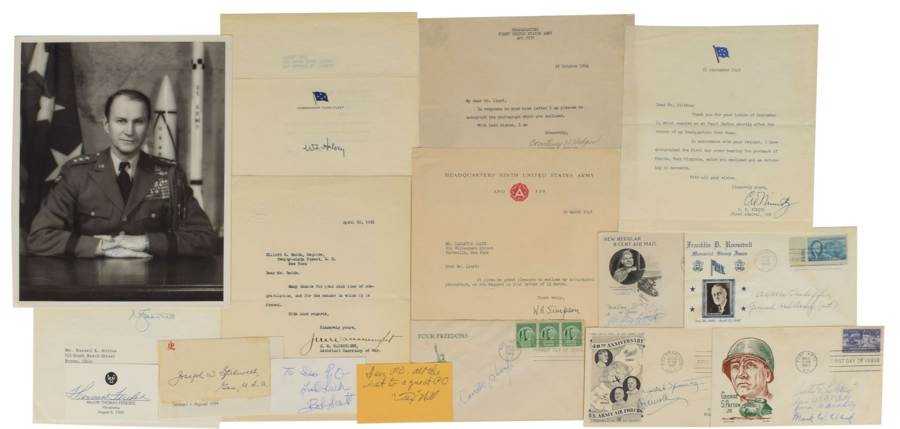 Collection of sixteen items, ranging in size from 3.5 x 2 to 8 x 10, each signed in ink by one or more notable heroes of World War II, including: James H. Doolittle (FDC), Thomas Ferebee (calling card), James M. Gavin (SP), William Halsey, Jr. (signature on top of a TLS), Tex Hill (business card), Courtney Hodges (TLS), George Marshall (TLS), Anthony McAuliffe (FDC), Chester W. Nimitz (TLS), Bob Scott (business card), David M. Shoup (FDC), William Hood Simpson (TLS), Joseph Stilwell (slip), Jonathan M. Wainwright (TLS), Hap Arnold and Carl Andrew Spaatz (FDC), and Omar Bradley, Mark W. Clark, and Curtis LeMay (FDC). In overall fine condition.