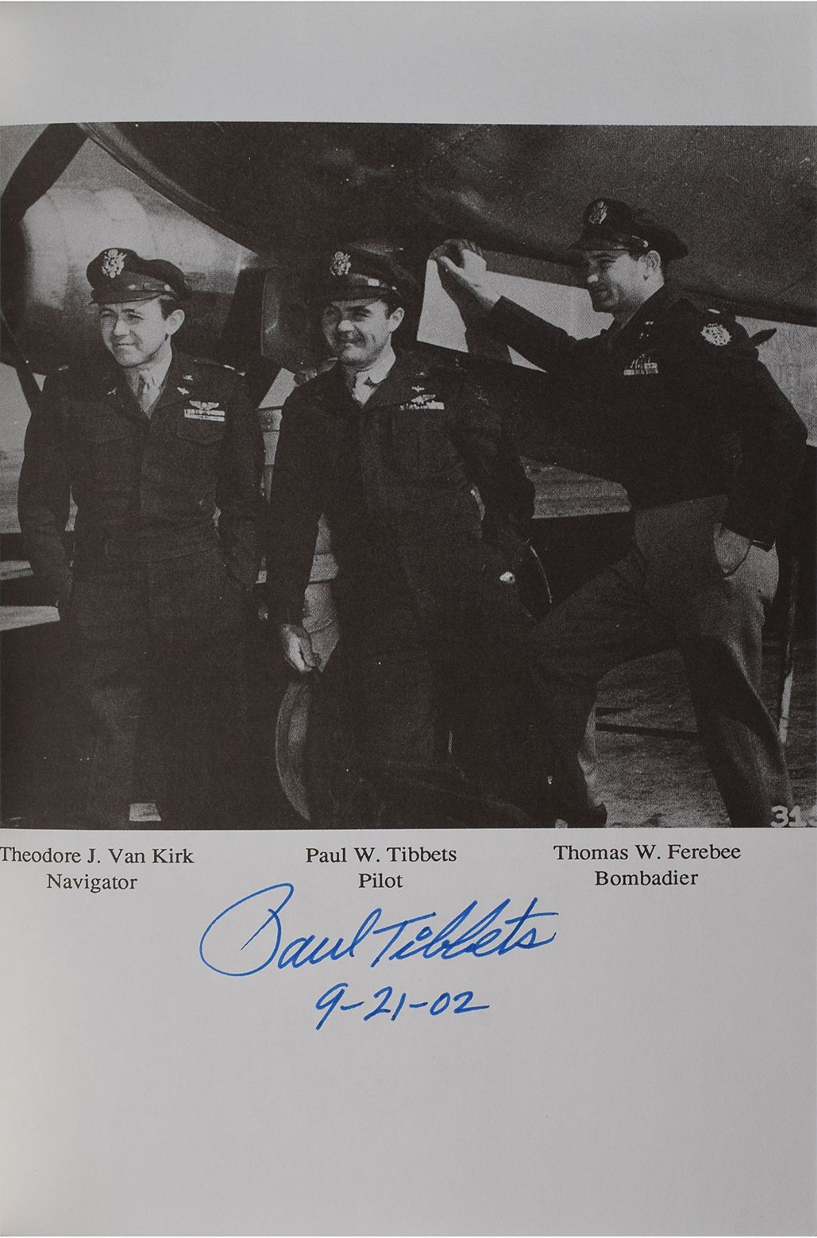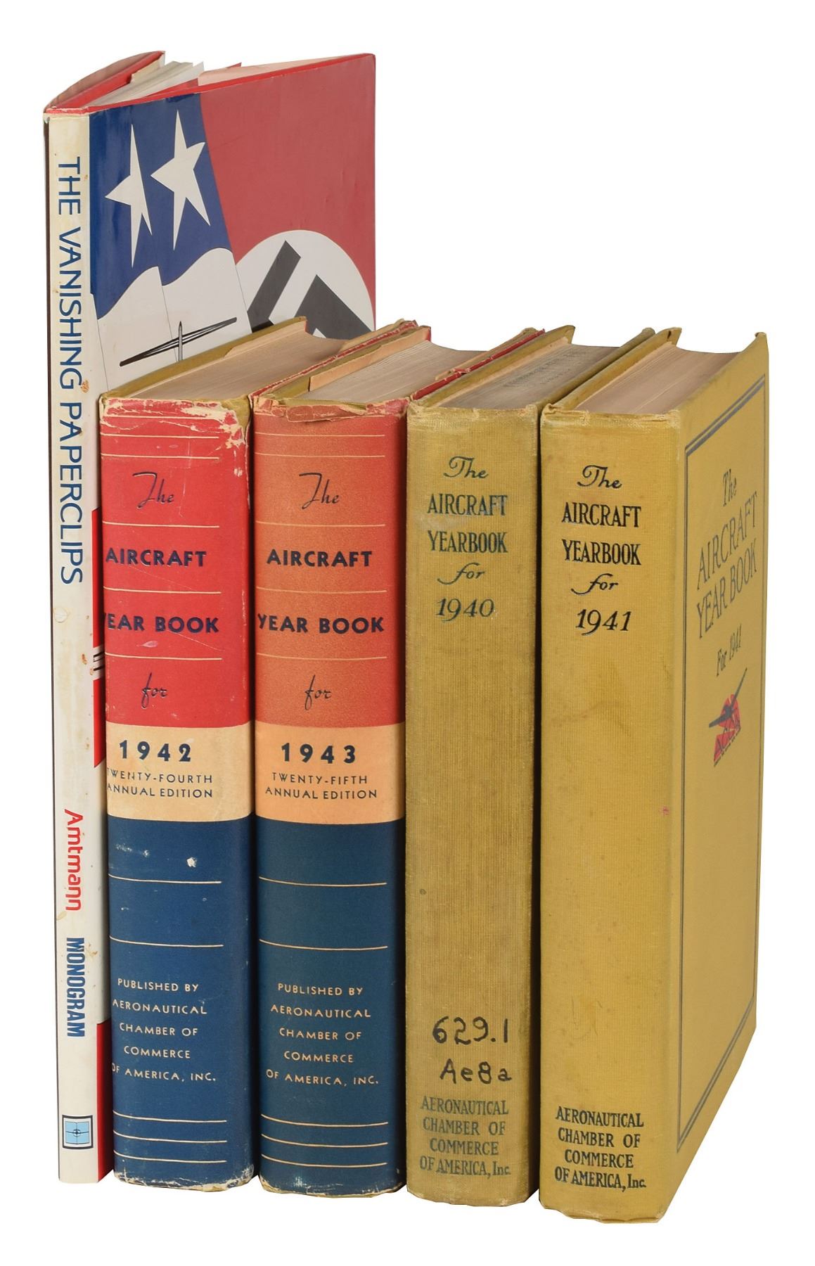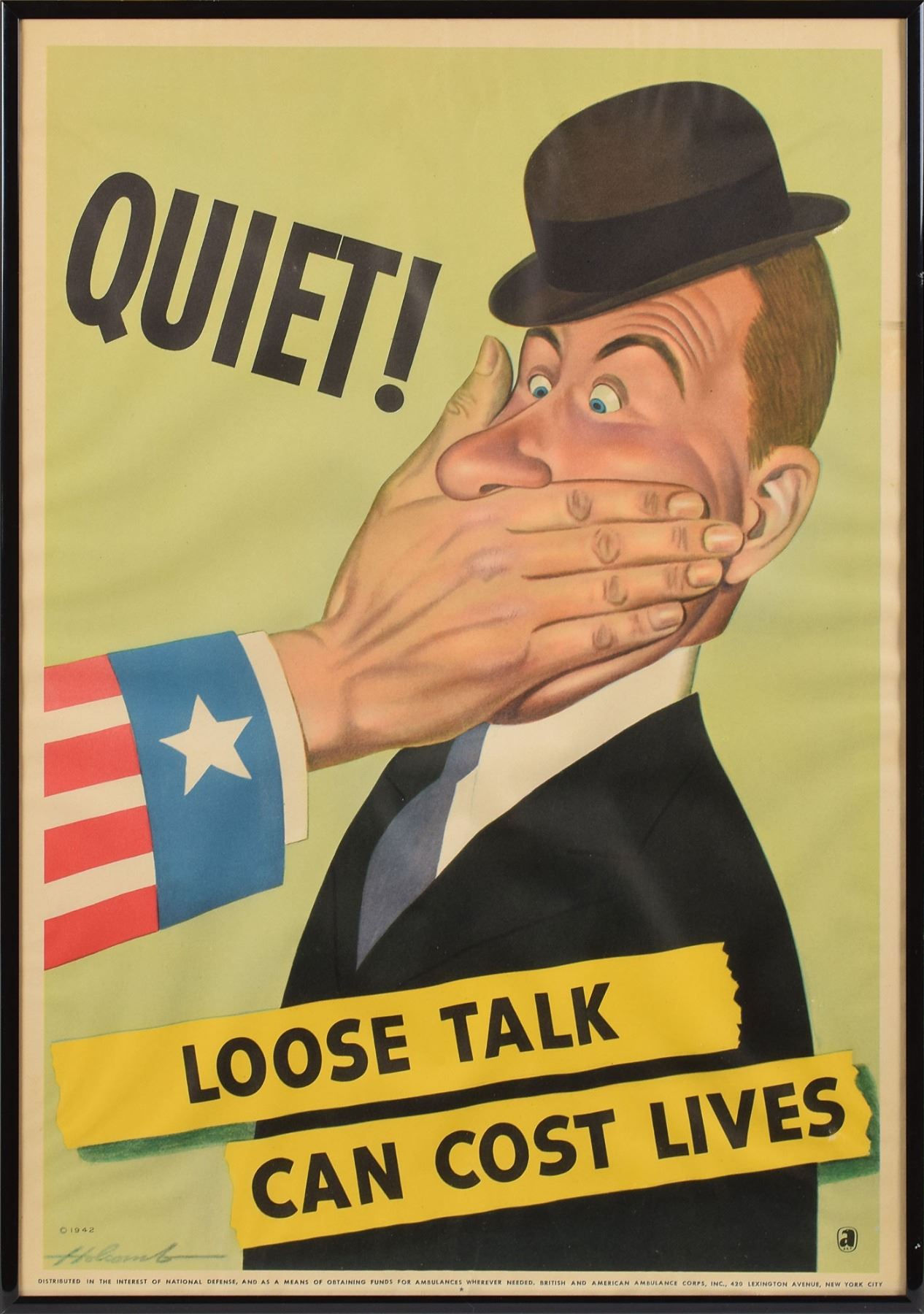 A framed original color 14 x 20 American World War II propaganda poster from 1942, depicting the hand of Uncle Sam over a man's mouth, reading, "Quiet! Loose Talk Can Cost Lives." Lower border reads, in part: "Distributed in the interest of national defense, and as a means of obtaining funds for ambulances wherever needed." Plus a collection of seven books related to WWII aviation, including: two copies of Return of the Enola Gay, both hardcover with dust jacket, each signed on the frontispiece in felt tip by the pilot, "Paul Tibbets, 9-21-02"; The Vanishing Paperclips: America's Aerospace Secret, hardcover with dust jacket, signed inside in ballpoint by the author, a German aerospace engineer who came to America in Operation Paperclip, "With best wishes, Hans H. Amtmann"; and unsigned hardcover copies of the Aeronautical Chamber of Commerce of America's annual Aircraft Year Book for the years 1940, 1941, 1942, and 1943 (two with dust jackets). In overall very good to fine condition.